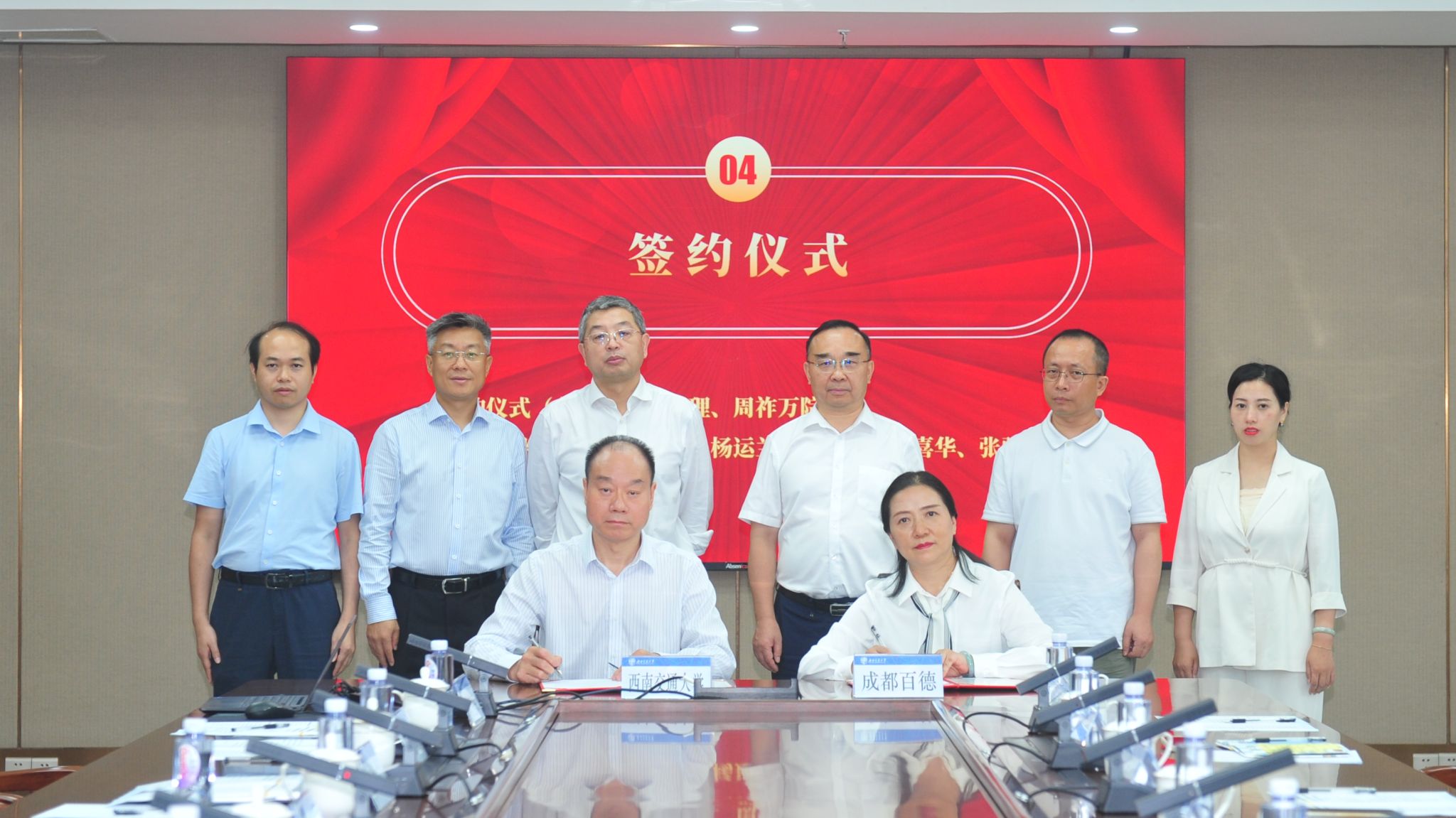 仪式由技术转移研究院院长张骏主持。化学学院院长周祚万、成都百德副总经理龚永红代表校企双方在成果转化暨产学研合作协议上签字。李成刚、科学技术发展研究院院长邹喜华为生物基新材料联合实验室揭牌。
