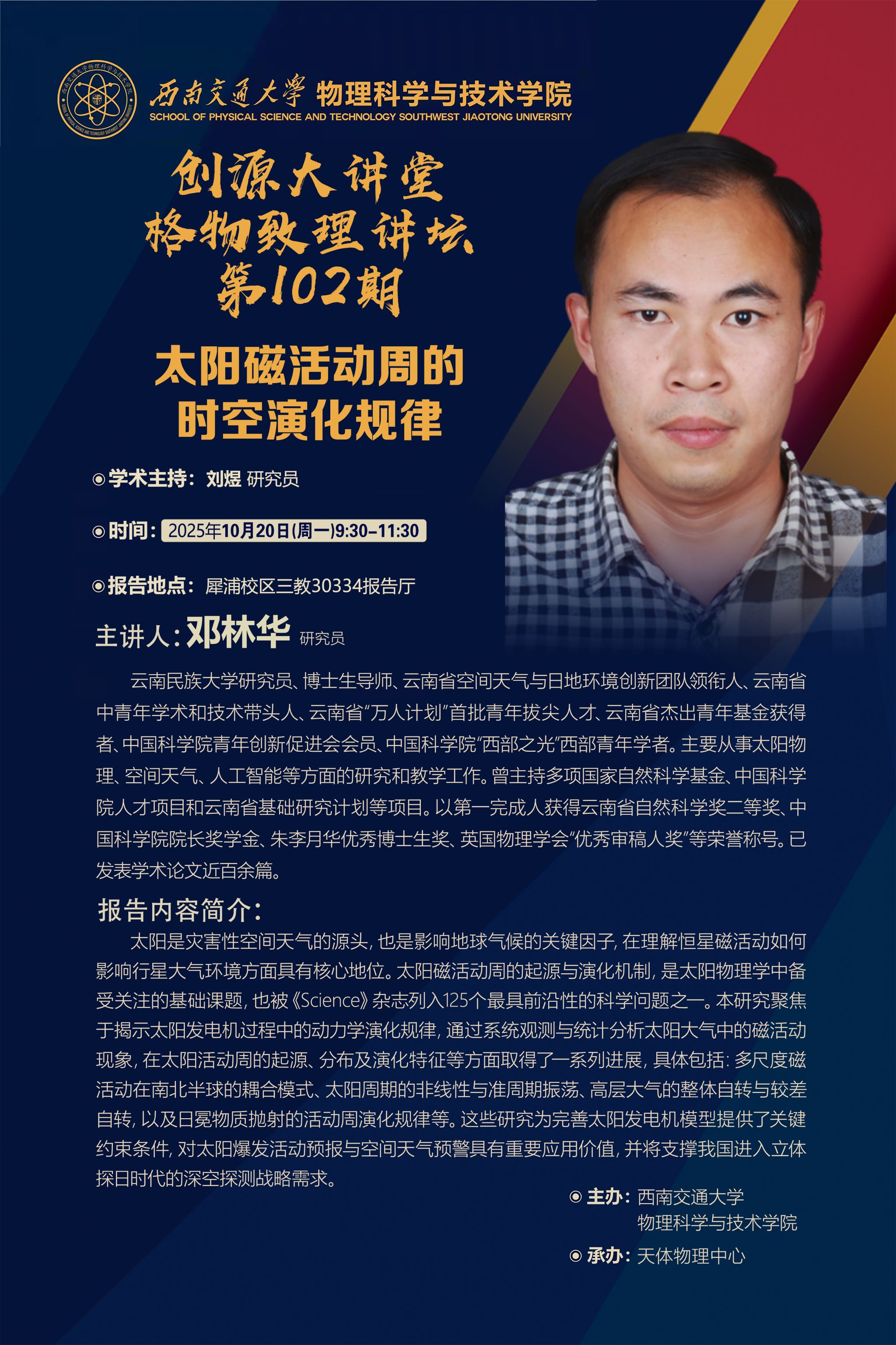 摘要:太阳是灾害性空间天气的根源,也是影响地球气候的关键因子,在理解恒星磁活动如何影响行星大气环境方面具有核心地位。太阳磁活动周的起源与演化机制,是太阳物理学中备受关注的基础课题,也被《Science》杂志列入125个最具前沿性的科学问题之一。本研究聚焦于揭示太阳发电机过程中的动力学演化规律,通过系统观测与统计分析太阳大气中的磁活动现象,在太阳磁活动周的起源、分布及演化特征等方面取得了一系列进展,具体包括:多尺度磁活动在南北半球的耦合模式、太阳周期的非线性与准周期振荡、高层大气的整体自转与较差自转,以及日冕物质抛射的活动周演化规律等。这些研究为完善太阳发电机模型提供了关键约束条件,对太阳爆发活动预报与空间天气预警具有重要应用价值,并将支撑我国进入立体探日时代的深空探测战略需求。