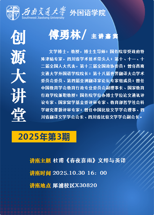 主讲人介绍:文学博士,教授,博士生导师;国务院享受政府特殊津贴专家,四川省学术技术带头人;第十、十一、十二届全国人大代表,第十三届全国政协委员;曾任西南交通大学外国语学院院长;第十八届世界翻译大会学术委员会委员、第四届亚洲翻译家论坛专家组成员;曾任中国教育学会教育行政专业委员会副理事长、国家教育行政学院兼职教授;国务院学位办博士学位论文通讯评议专家、国家留学基金委评审专家、教育部哲学社会科学研究课题评审专家;曾任中国比较文学学会理事、四川省翻译文学学会会长、四川省比较文学学会副会长。