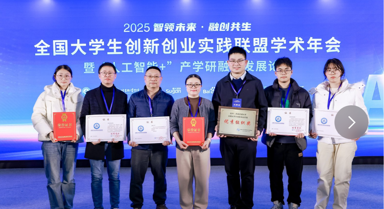 12月4日至6日,2025年全国大学生创新创业实践联盟学术年会暨“人工智能+”产学研融合发展论坛在北京举行。本届年会以“智领未来,融创共生”为主题,汇聚了全国682所高校及近百家知名企业专家学者,共同探讨人工智能时代的创新创业教育新路径。西南交通大...