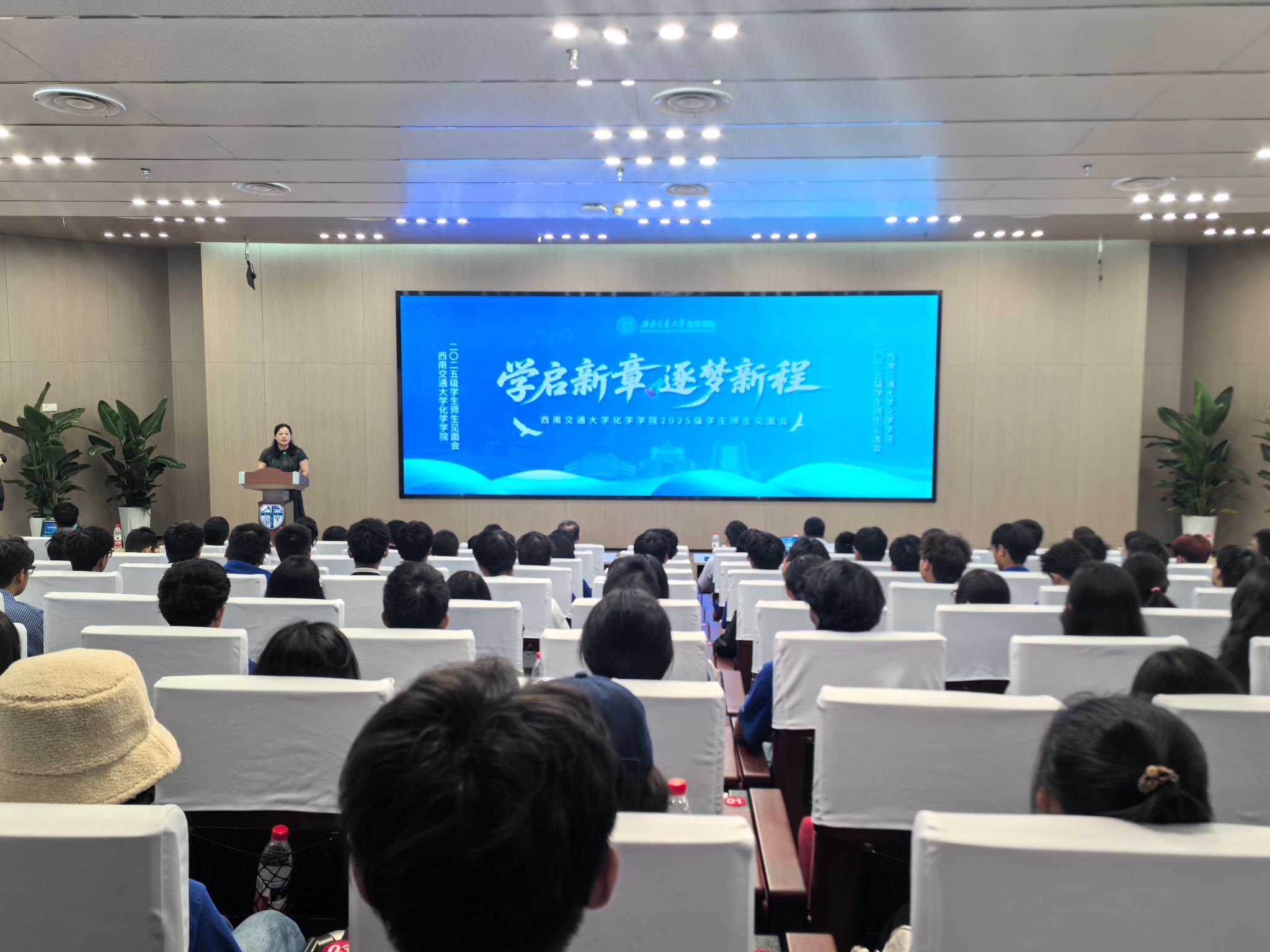 近日,化学学院在犀浦校区图书馆二号报告厅举行2025级新生师生见面会。化学学院党委书记向仲敏,院长、党委副书记周祚万,党委副书记张春燕,副院长王勇、王雅雯,院务委员杨静晖,校外生涯导师、校友代表田馨,学院“三系一部”主任,2025级本科班导师,...