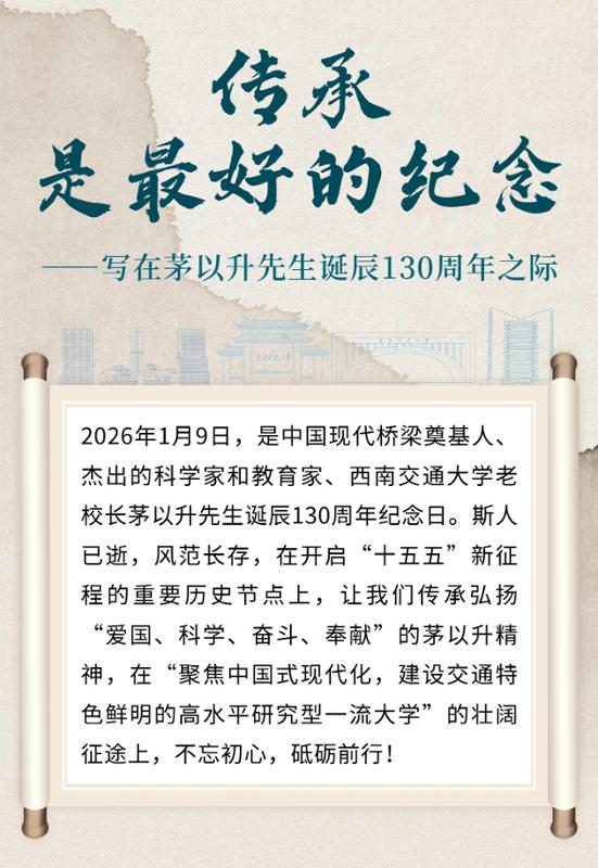 当2026年1月9日的晨光为天府之国镀上暖晖,中国现代桥梁奠基人、杰出的科学家和教育家、西南交通大学老校长茅以升先生迎来诞辰130周年的光辉时刻。为献礼茅以升先生诞辰130周年,历经一年打磨,中国科协“科学家故事舞台剧推广行动”核心剧目、西南交大原...