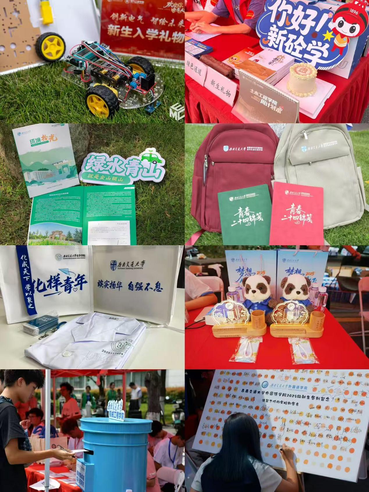 各学院为新生准备了丰富的迎新活动和专属礼包,既体现专业魅力又展示人文关怀。电气工程学院为新生送上“新能源寻迹小车”,鼓励大家脚踏实地、勇于探索。智慧城市与交通学院为新生准备“青春二十四锦笺”周历本,用24项精心设计的成长倡议,帮助新生做好成长规划。土木工程学院和环境工程学院分别为报到日过生日的新生准备专属院徽蛋糕和手写祝福信惊喜庆生,祝贺他们开启大学生活的精彩第一天。机械工程学院和交通运输与物流学院以“时光邮筒”“交运慢递”的形式,邀请新生写下“给自己的一封信”,并将在四年本科结束之际返还,一起见证新交大人四年的蜕变与成长。利兹学院定制背包、包挂以及领带、领结,为新生赠予专属“小栗子”身份象征。经济管理学院送出“笔筒小夜灯”,为新生们点亮大学之旅的第一帧。公共管理学院的雨伞、文件袋、书包三件套,承载着对新生“遮风挡雨、包容收纳、承载梦想”的美好祝福。