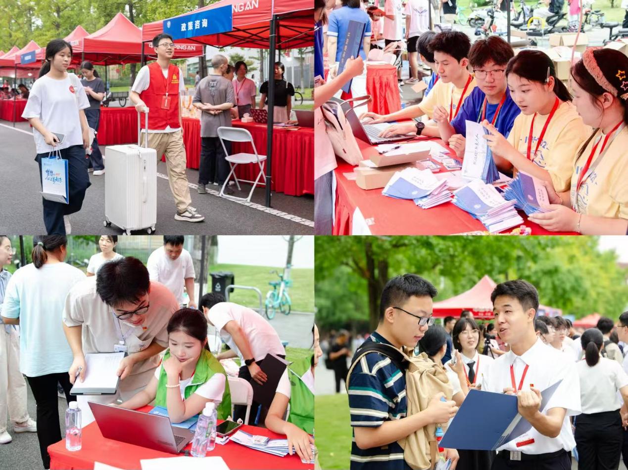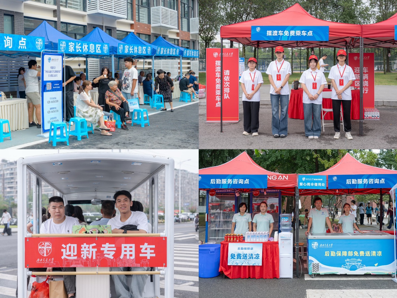 学校设立学院集中接待点,统一布置房伞、桌椅、横幅标识等,配备照明设备、无线网络、应急通信5G车和防暑降温设备,家长休息处免费提供饮用水及冷饮,并设置行李暂存处、手机充电站、爱心雨伞和雨衣,配备摆渡车和公交车做好校园接送服务,全力保障新生入学畅通无阻。
