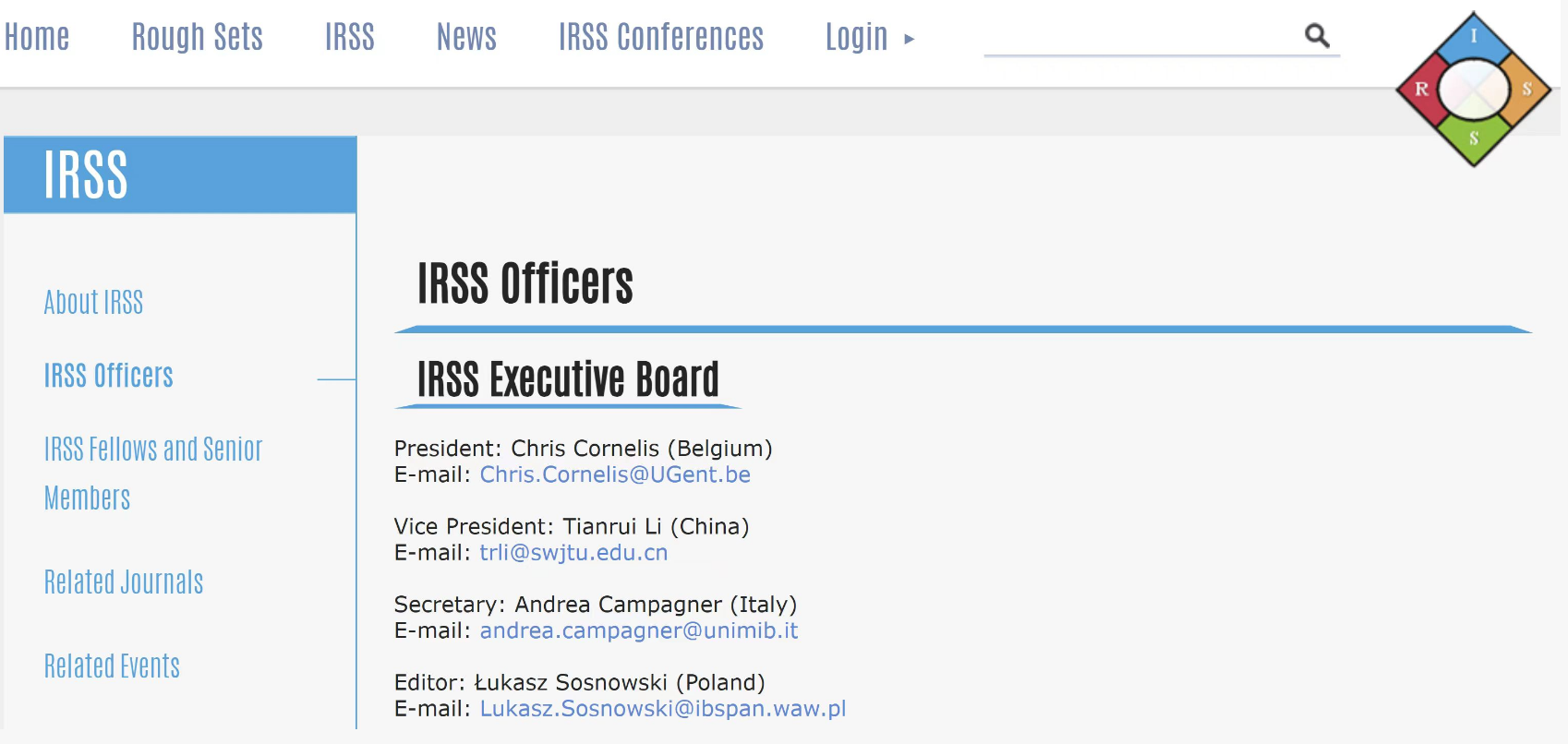 国际粗糙集学会(International Rough Set Society,IRSS)创建于2005年,下设执行委员会(Executive Board)、指导委员会(Steering Committee)和顾问委员会(Advisory Board)三个机构,是一个为了促进粗糙集理论和技术学科领域学术交流与应用推广而成立的非营利性国际学术组织。学会由执行委员会领导,其中副理事长和秘书长由选举产生。国际粗糙集学会每年召开一次国际专业学术会议,主题覆盖了粗糙集、粒计算、三支决策、数据挖掘、机器学习、人工智能等多个研究领域,为全球科研人员提供分享最新研究成果和创新思想的平台。