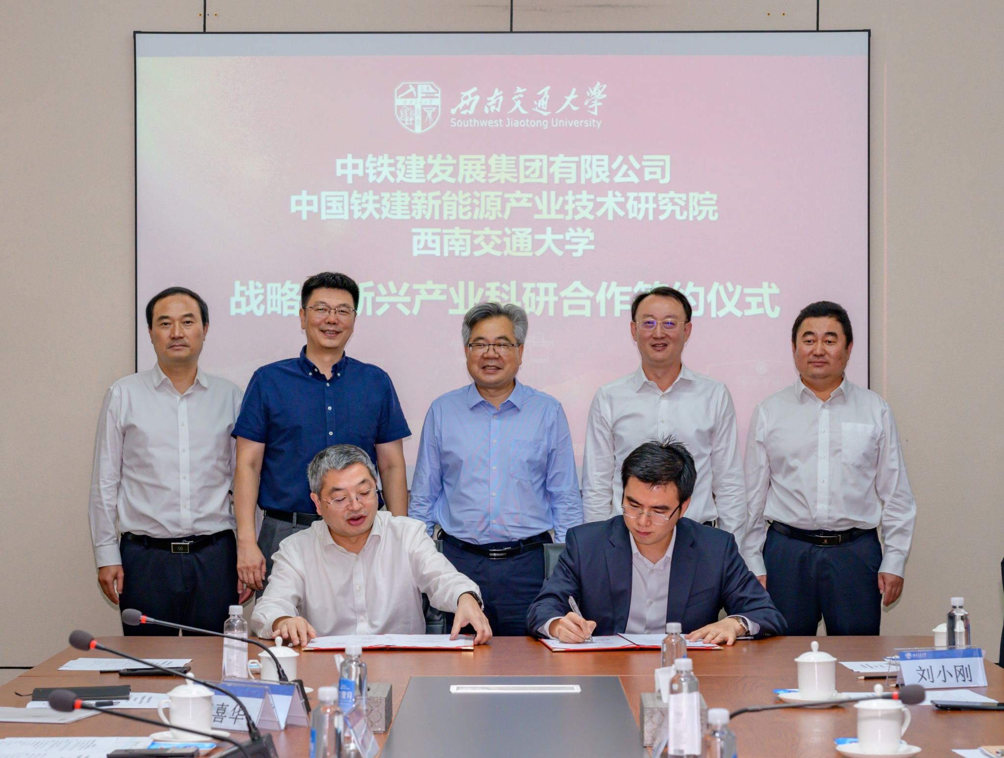 近日,西南交通大学与中铁建发展集团有限公司、中国铁建新能源产业技术研究院在蓉签署战略性新兴产业科研合作协议。校长闫学东,中国工程院院士、西南交通大学首席教授何川,党委常委、副校长王平;中铁建发展集团有限公司董事长周庆国,副总经理刘小刚、李兢,中铁第一勘察设计院集团有限公司副院长赵文聘等出席签约仪式。