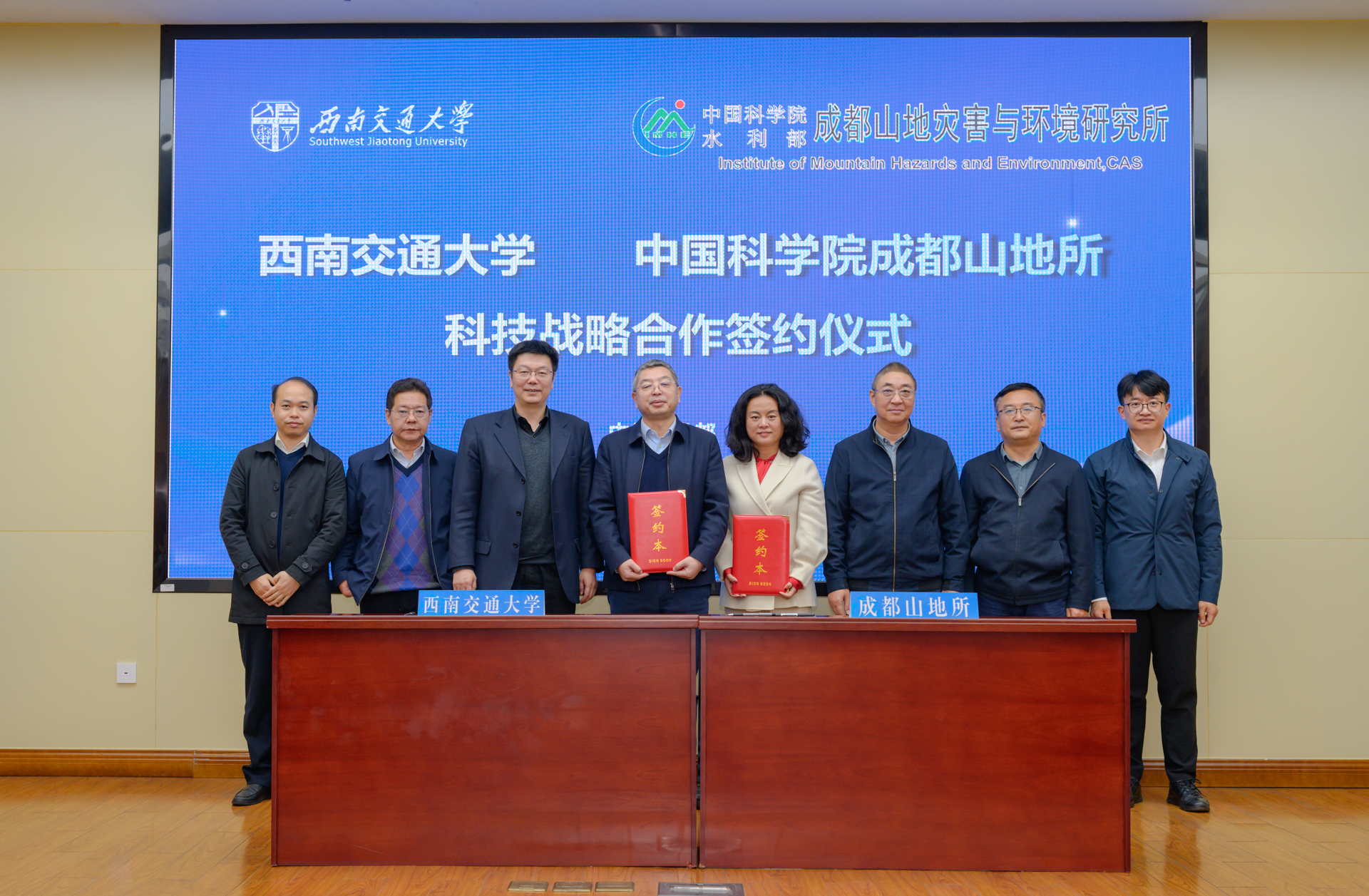 11月10日,西南交通大学与中国科学院、水利部成都山地灾害与环境研究所(以下简称“成都山地所”)科技战略合作签约仪式在犀浦校区举行。成都山地所所长康世昌、纪委书记周鹏浩,西南交通大学校长闫学东出席签约仪式。校党委常委、副校长王平主持仪式。