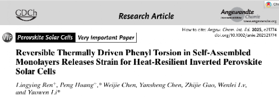 近日,西南交通大学前沿科学研究院黄鹏特聘研究员带领的智能光电器件团队与苏州大学李耀文教授团队合作,在倒置钙钛矿太阳能电池研究领域取得重要突破。相关成果以《Reversible Thermally Driven Phenyl Torsion in Self-Assembled Monolayers Releases Strain for Heat-Resilient Inverted Perovskite Solar Cells》为题,发表于国际化学领域顶级期刊《Angewandte Chemie International Edition》(简称Angew.,中国科学院一区Top期刊,影响因子17.0),并被选为VIP论文。论文第一完成单位为西南交通大学,第一作者为前沿科学研究院与材料科学与工程学院研三学生任玲莹。
