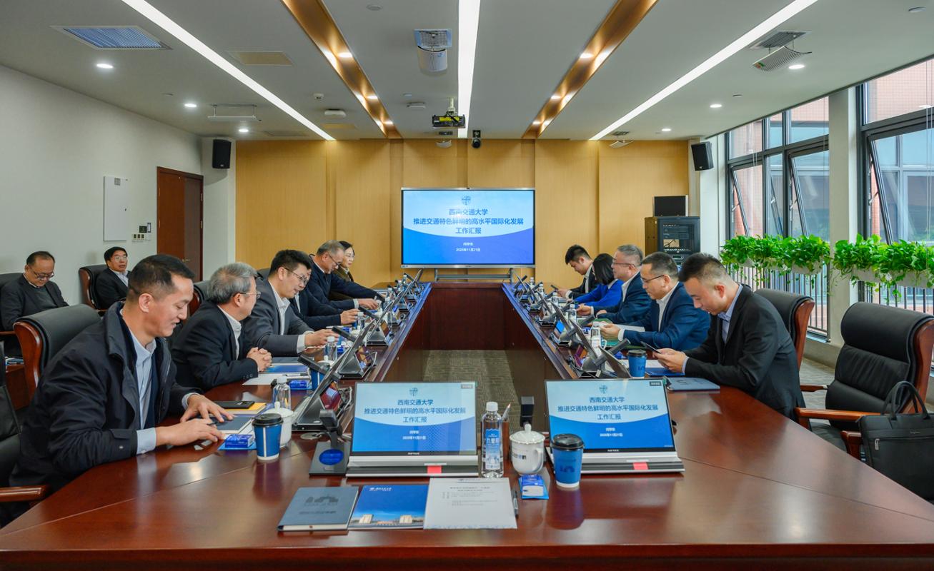 闫学东汇报学校推进交通特色鲜明的高水平国际化发展相关工作情况。他表示,西南交通大学始终聚焦服务高质量共建“一带一路”,助力中国高铁树立国际标杆,目前已构建起高水平、有特色的“大国际”办学格局,同60个国家和地区的200余所院校及科研机构建立合作关系。学校统筹推进教育、科技、人才一体发展,通过“引进来”“走出去”多重举措,全面增强在国际领域的辐射力与影响力,以轨道交通战略科技力量服务“一带一路”互联互通。