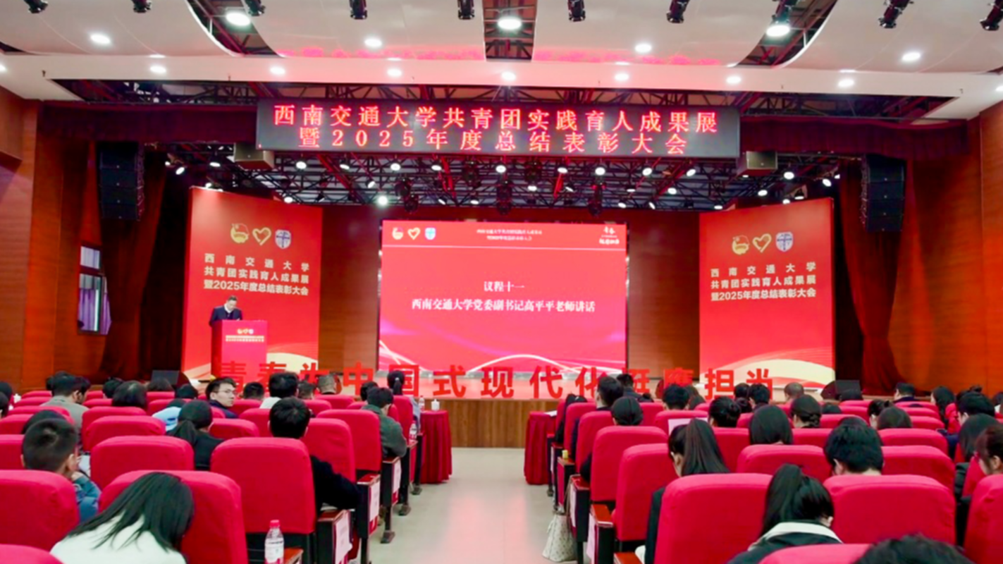 11月28日,西南交通大学共青团实践育人成果展暨2025年度总结表彰大会在犀浦校区举行。校党委副书记高平平,共青团四川省委学校部副部长闫宇薇,共青团乐山市委书记伍文隆、共青团郫都区委书记徐潘、共青团金牛区委副书记弋欢出席大会。