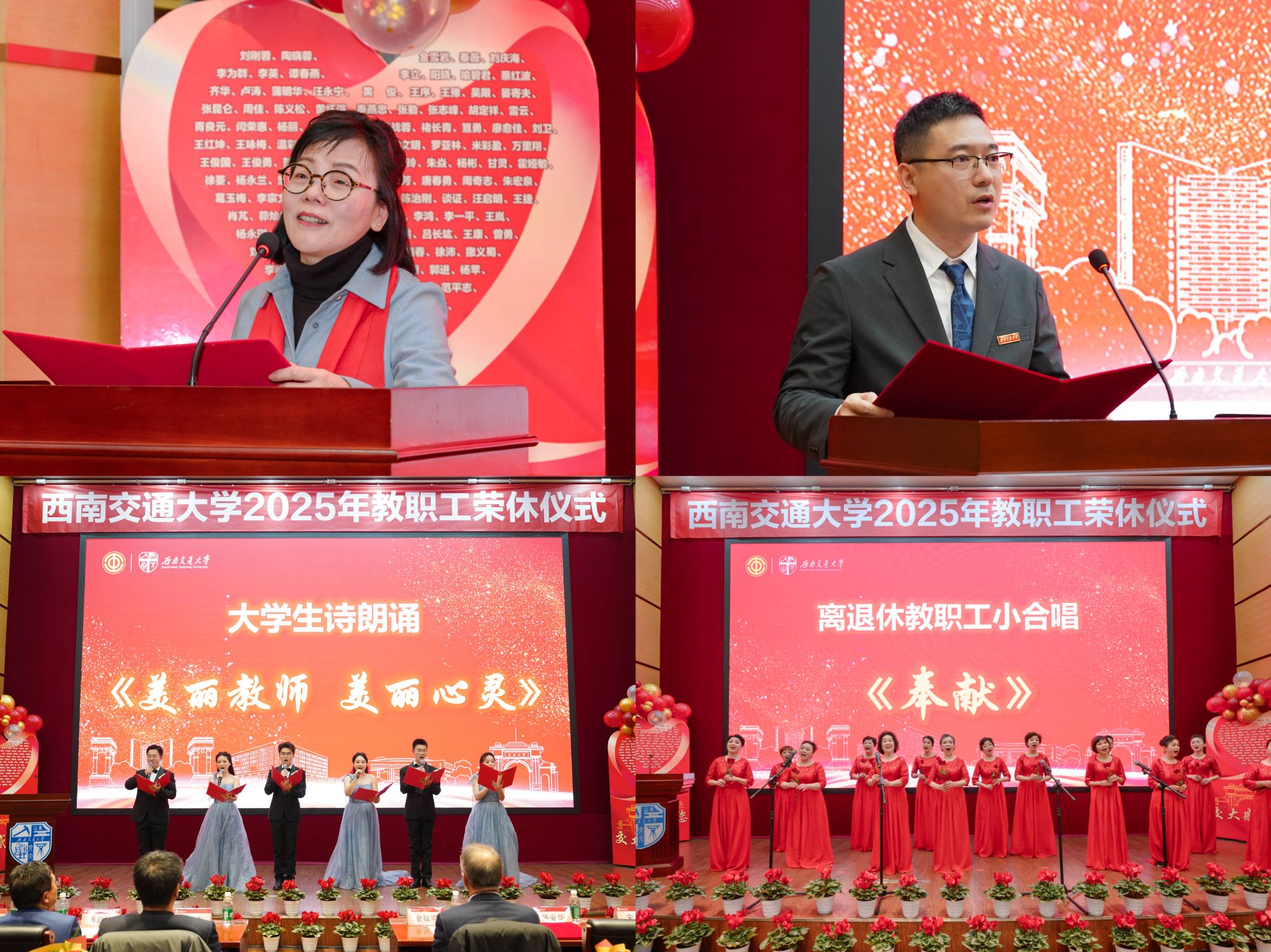 仪式上播放了2025年荣休教职工风采主题片《交大记忆》以及离退休教职工生活剪影《向着幸福再出发》,学生代表献上诗朗诵《美丽教师 美丽心灵》向荣休教职工致敬,离退休教职工带来小合唱《奉献》。活动在全体合唱校歌声中落下帷幕。