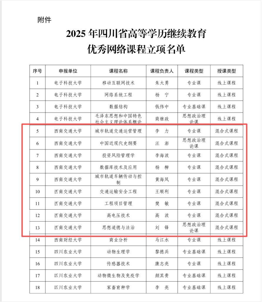 近日,四川省教育厅公布2025年高等学历继续教育优秀网络课程评选结果。西南交通大学共有9门课程立项为四川省高等学历继续教育优秀网络课程,入选总数位列全省高校第一。
