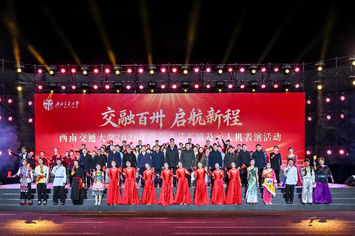 岁序更替,华章新启;载歌载舞,漫天华彩。12月31日晚,西南交通大学2026年跨年文艺汇演及无人机表演活动在犀浦校区北区体育场举行。学校党委书记余敏明,校长闫学东,党委副书记杨爱华,党委副书记、纪委书记夏玉峰,党委副书记高平平,党委常委、副校长康国政、刘长军、王平、何正友、晏启祥,党委常委汪铮、朱剑松,校长助理宋新,中国工商银行股份有限公司成都金牛支行党委书记、行长田庆与学校近万名师生员工、校友欢聚一堂,共迎新年。