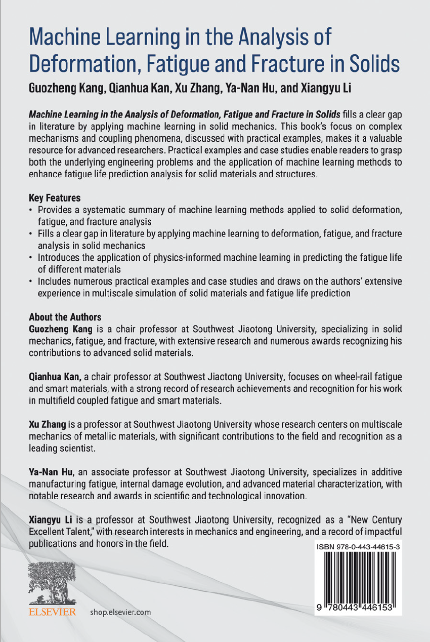 近日,由国际著名学术出版机构Elsevier和中国科学出版社联合出版的学术专著 《Machine Learning in the Analysis of Deformation, Fatigue and Fracture in Solids》 正式发布。该书由西南交通大学康国政教授团队(康国政、阚前华、张旭、胡雅楠、李翔宇等)在国家自然科学基金重大项目(12192210; 12192214)和西南交通大学本科教材建设研究项目(2025)的支持下撰写。中文版率先由科学出版社出版,旨在及时向国内学术界与工业界介绍此前沿交叉领域的最新进展;其后出版的英文版,则是在此基础上,结合团队和国内外最新研究进展进行了大幅调整与完善,旨在面向全球读者分享该领域的研究方法与工程应用实践,促进了国际学术交流。