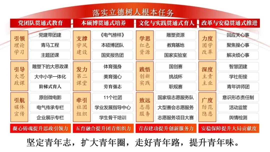 近年来,电气工程学院团委以习近平新时代中国特色社会主义思想为指导,紧扣立德树人根本任务,不断坚定“青年志”、扩大“青年圈”、走好“青年路”、提升“青年味”,以学科文化为主线、“贯通”为主旋律,构建具有电气特色的共青团工作体系,融入“大思政”格局,推动共青团工作高质量发展。依托“青马工程”“四川电力青年说”“创新电气135计划”“雕塑下的大思政课”等品牌活动和项目,在扎实深耕思想引领、打造学科特色实践育人品牌、着力提升青年创新力、用好新媒体助力青年工作等方面取得显著育人成果。