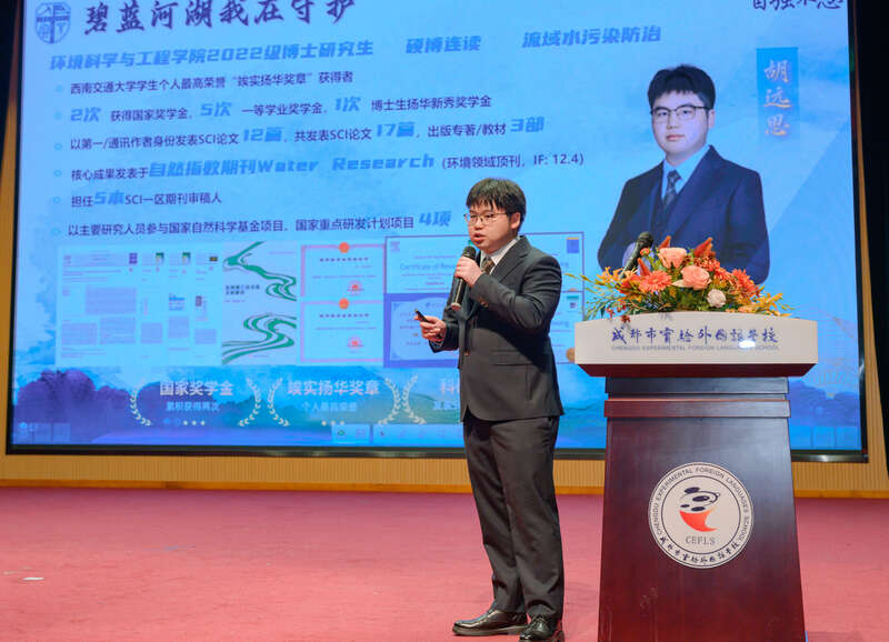 在首场讲座中,西南交通大学胡远思博士以《“化”浊为清:用分子魔法点亮碧蓝河湖》为题,深入浅出地阐释了化学课本中的反应方程式如何助力河湖污染治理,使学生切身感受到知识服务“美丽中国”建设的现实意义。