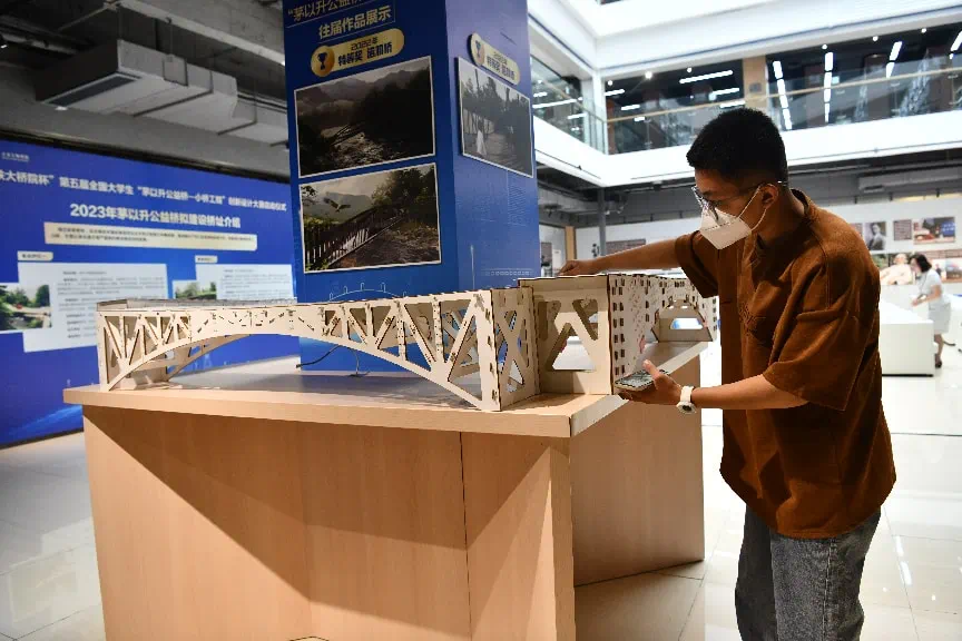 2023年5月12日,四川成都,“中铁大桥院杯”第五届全国大学生“茅以升公益桥—小桥工程”创新设计大赛在西南交通大学启动。图为启动仪式现场展示的2022年获奖桥梁设计作品。中新社记者 张浪 摄