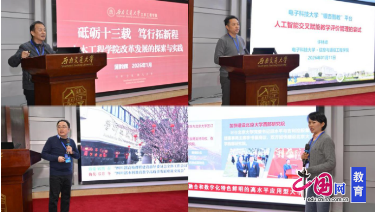 专题报告环节,沈火明以《高校教师教学发展与智慧教学路径》为题,介绍了四川高校教师教学发展指数、教创赛获奖基本情况,并探讨了智慧课程构建与未来教学路径。西南交通大学土木工程学院院长蒲黔辉以《砥砺十三载 笃行拓新程》为题,回顾了该学院的历史积淀与改革历程,分享了深化改革的具体举措与对未来转型发展的思考;电子科技大学许林峰副教授以《“银杏智教”平台:人工智能交叉赋能教学评价管理的尝试》为题,介绍了人工智能技术在教学评价与管理中的创新应用;西南石油大学教务处处长廖柯熹教授以《服务国家能源战略,构建“双能”驱动的一流人才培养“新蜀道”》为题,分享了能源行业特色人才培养的实践经验;吉利学院校长助理王茜教授以《破局与进阶:吉利学院产教融合之路》为题,阐述了产教融合在应用型人才培养中的实施路径。此外,在交流研讨环节,与会代表就智慧教学改革、特色育人体系等议题展开了深入讨论。