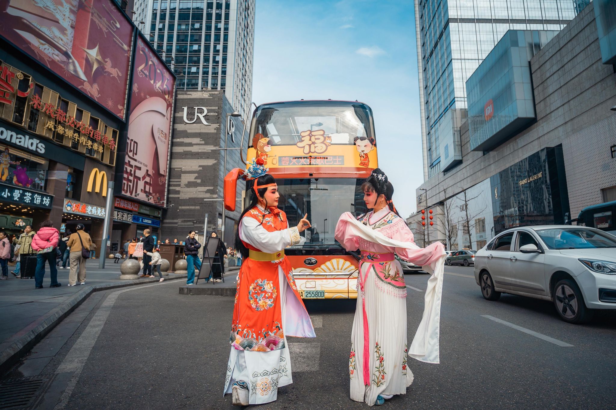 春节假期,四川省成都市“趣耍巴士”特色主题观光车非遗文化表演。