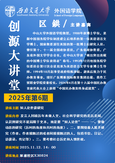 主讲人介绍:中山大学外国语学院教授,1988年获博士学位,是新中国国务院学位制度建立后培养的第一位英语语言文学博士,国家教委派往英国的第一批博士后研究人员。曾任第十、十一届全国政协委员,广东省政协常委,广东省外国文学学会会长,在中山大学获“做出突出贡献的中国博士学位获得者”称号。1993年12月经国务院学位委员会第12次会议批准为英语语言文学专业博士生导师。退休后致力于民办教育事业,现任广东博雅国际教育集团总裁、焦作工贸职业学院荣誉校长。2024年4月在第十六届中国民办教育家代表大会上获得“中国民办教育终身成就奖”。