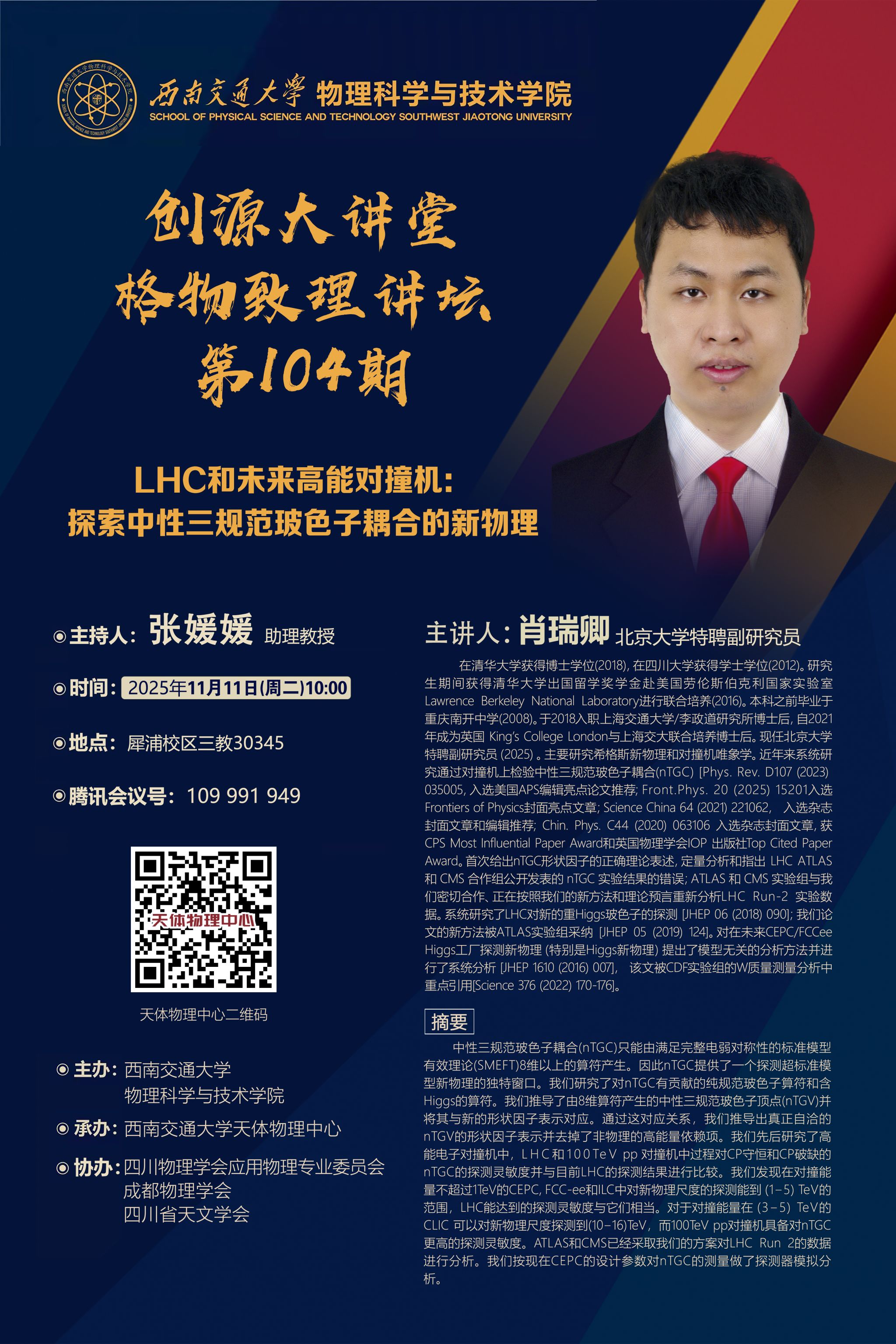 简历:肖瑞卿,北京大学特聘副研究员,在清华大学获得博士学位(2018),在四川大学获得学士学位(2012)。研究生期间获得清华大学出国留学奖学金赴美国劳伦斯伯克利国家实验室Lawrence Berkeley National Laboratory进行联合培养(2016)。本科之前毕业于重庆南开中学(2008)。于2018年入职上海交通大学/李政道研究所博士后,自2021年成为英国 King’s College London与上海交大联合培养博士后。现任北京大学特聘副研究员(2025)。主要研究希格斯新物理和对撞机唯象学。近年来系统研究通过对撞机上检验中性三规范玻色子耦合(nTGC) [Phys. Rev. D107 (2023) 035005, 入选美国APS编辑亮点论文推荐; Front.Phys. 20 (2025) 15201入选Frontiers of Physics封面亮点文章;Science China 64 (2021) 221062, 入选杂志封面文章和编辑推荐; Chin. Phys. C44 (2020) 063106 入选杂志封面文章,获CPS Most Influential Paper Award和英国物理学会IOP 出版社Top Cited Paper Award。首次给出nTGC形状因子的正确理论表述,定量分析和指出 LHC ATLAS 和 CMS 合作组公开发表的 nTGC 实验结果的错误;ATLAS 和 CMS 实验组与我们密切合作、正在按照我们的新方法和理论预言重新分析LHC Run-2实验数据。系统研究了LHC对新的重Higgs玻色子的探测 [JHEP 06 (2018) 090];我们论文的新方法被ATLAS实验组采纳 [JHEP 05 (2019) 124]。对在未来CEPC/FCCee Higgs工厂探测新物理(特别是Higgs新物理)提出了模型无关的分析方法并进行了系统分析 [JHEP 1610 (2016) 007], 该文被CDF实验组的W质量测量分析中重点引用[Science 376 (2022) 170-176]。