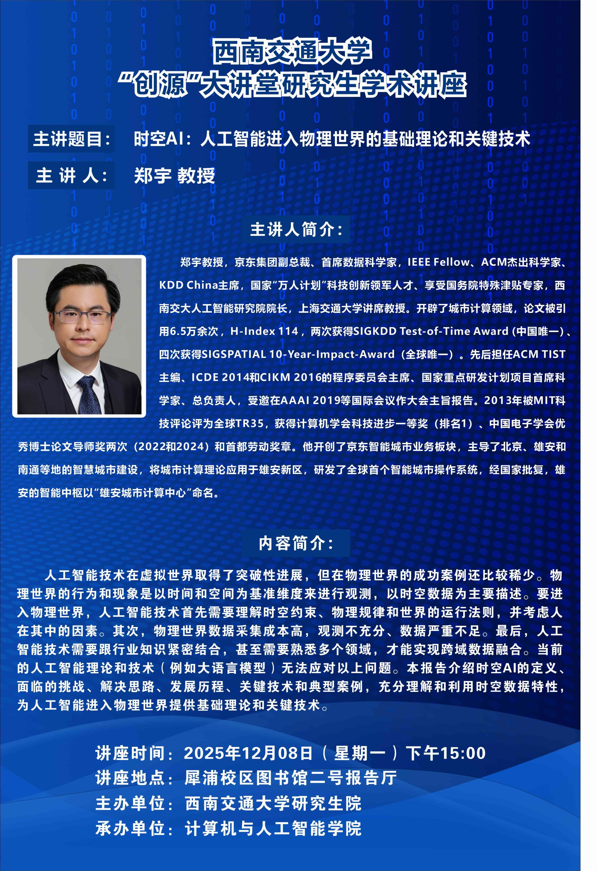 郑宇教授,京东集团副总裁、首席数据科学家,IEEE Fellow、ACM杰出科学家、KDD China主席,西南交大人工智能研究院院长,上海交通大学讲席教授。开辟了城市计算领域,论文被引用6.5万余次,H-Index 114,两次获得SIGKDD Test-of-Time Award(中国唯一)、四次获得SIGSPATIAL 10-Year-Impact-Award(全球唯一)。先后担任ACM TIST主编、ICDE 2014和CIKM 2016的程序委员会主席、国家重点研发计划项目首席科学家、总负责人,受邀在AAAI 2019等国际会议作大会主旨报告。2013年被MIT科技评论评为全球TR35,获得计算机学会科技进步一等奖(排名1)、中国电子学会优秀博士论文导师奖两次(2022和2024)和首都劳动奖章。他开创了京东智能城市业务板块,主导了北京、雄安和南通等地的智慧城市建设,将城市计算理论应用于雄安新区,研发了全球首个智能城市操作系统,经国家批复,雄安的智能中枢以“雄安城市计算中心”命名。