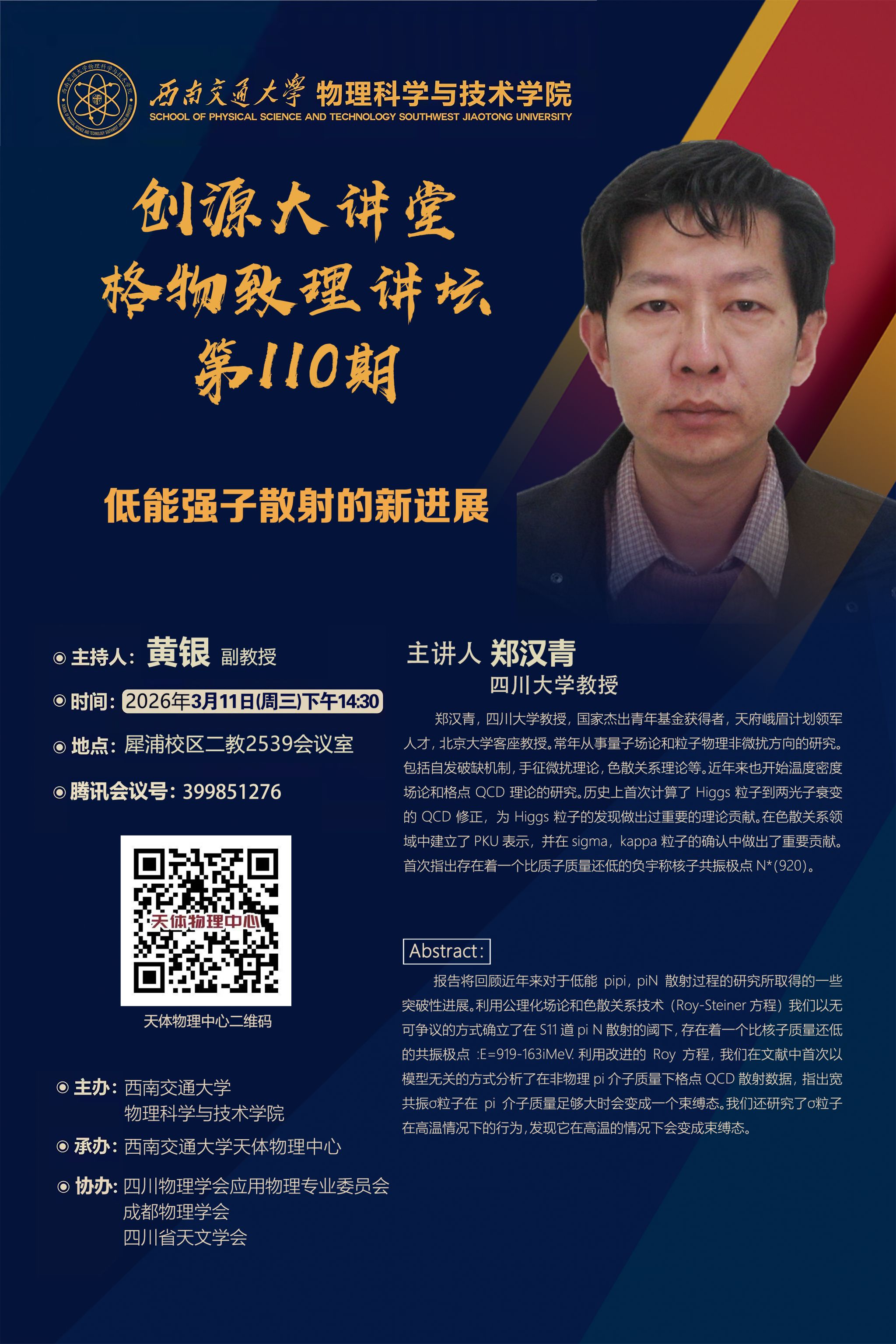 主讲人简历:郑汉青,四川大学教授,国家杰出青年基金获得者,北京大学客座教授。常年从事量子场论和粒子物理非微扰方向的研究。包括自发破缺机制,手征微扰理论,色散关系理论等。近年来也开始温度密度场论和格点QCD理论的研究。历史上首次计算了Higgs粒子到两光子衰变的QCD修正,为Higgs粒子的发现做出过重要的理论贡献。在色散关系领域中建立了PKU表示,并在sigma,kappa 粒子的确认中做出了重要贡献。首次指出存在着一个比质子质量还低的负宇称核子共振极点N*(920)。