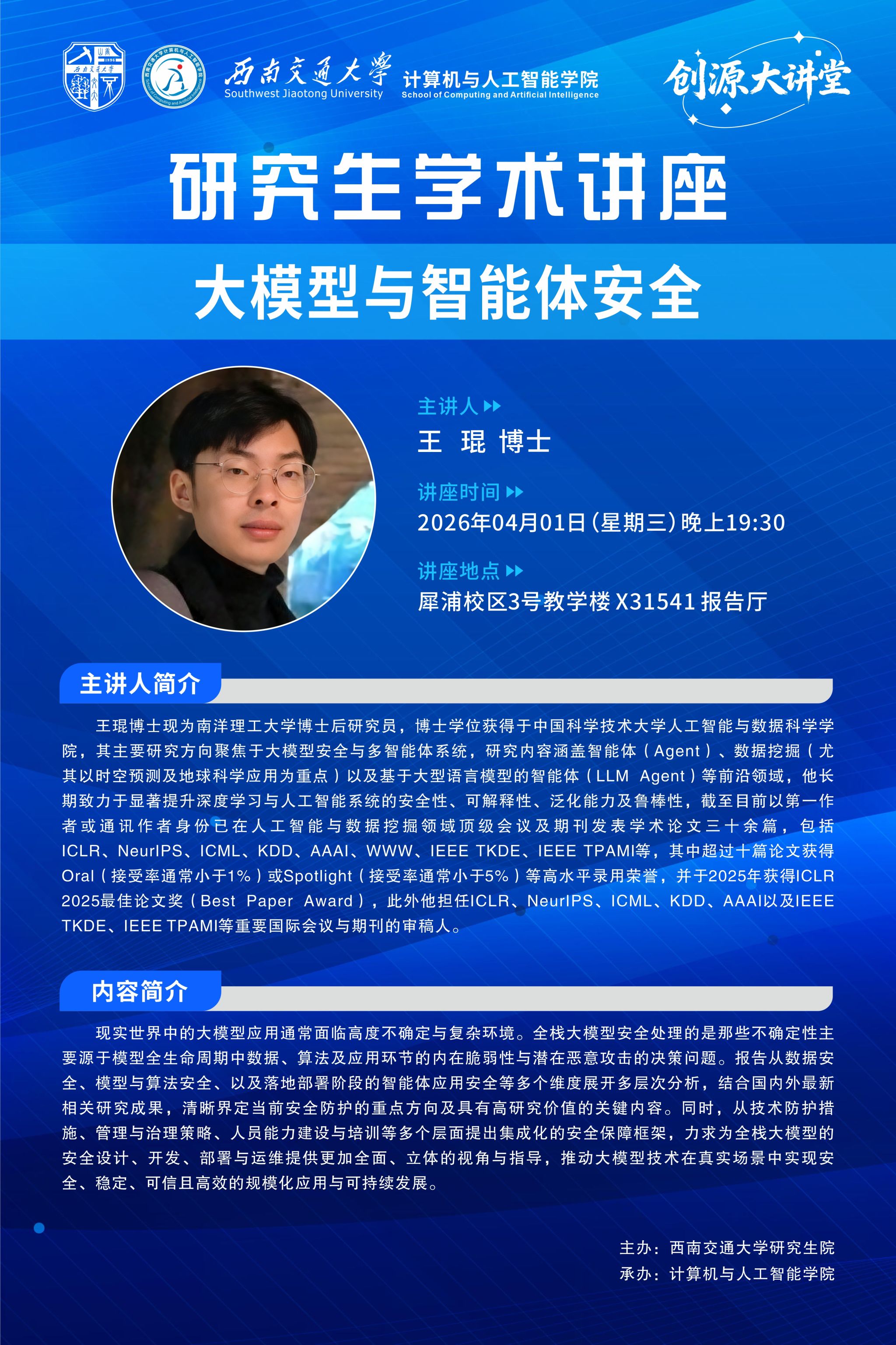王琨博士现为南洋理工大学博士后研究员,博士学位获得于中国科学技术大学人工智能与数据科学学院,其主要研究方向聚焦于大模型安全与多智能体系统,研究内容涵盖智能体(Agent)、数据挖掘(尤其以时空预测及地球科学应用为重点)以及基于大型语言模型的智能体(LLM Agent)等前沿领域,他长期致力于显著提升深度学习与人工智能系统的安全性、可解释性、泛化能力及鲁棒性,截至目前以第一作者或通讯作者身份已在人工智能与数据挖掘领域顶级会议及期刊发表学术论文三十余篇,包括ICLR、NeurIPS、ICML、KDD、AAAI、WWW、IEEE TKDE、IEEE TPAMI等,其中超过十篇论文获得Oral(接受率通常小于1%)或Spotlight(接受率通常小于5%)等高水平录用荣誉,并于2025年获得ICLR 2025最佳论文奖(Best Paper Award),此外他担任ICLR、NeurIPS、ICML、KDD、AAAI以及IEEE TKDE、IEEE TPAMI等重要国际会议与期刊的审稿人。