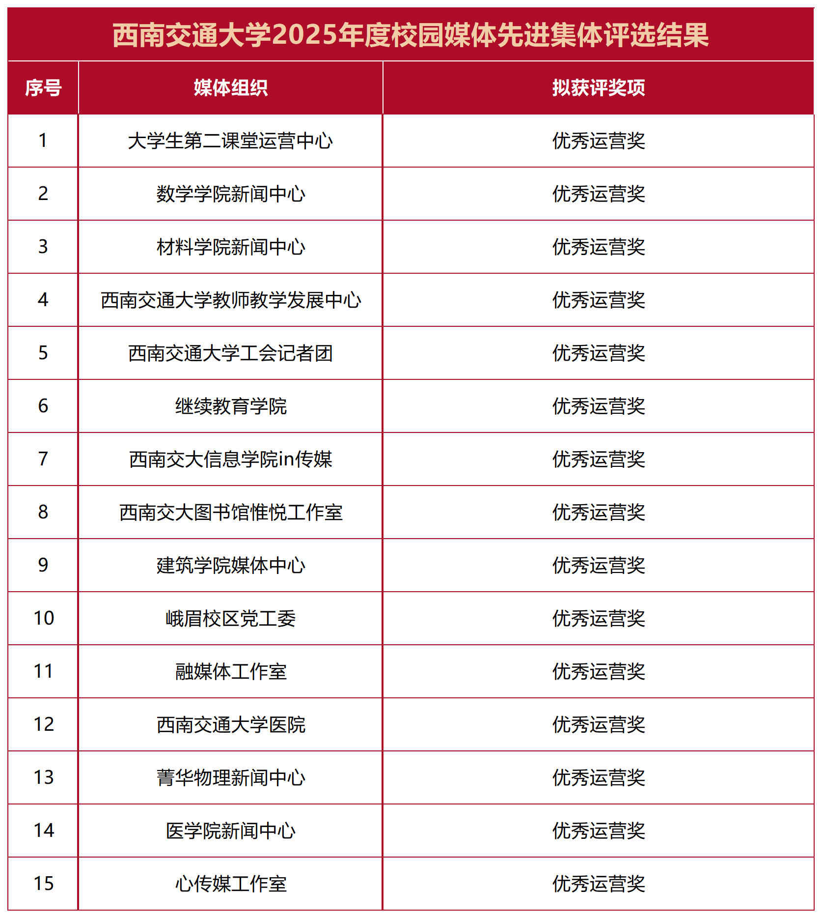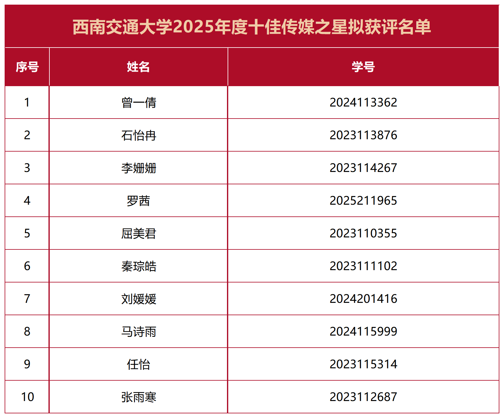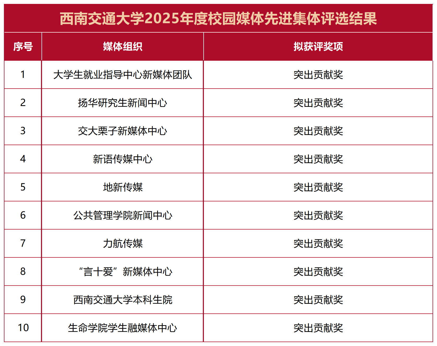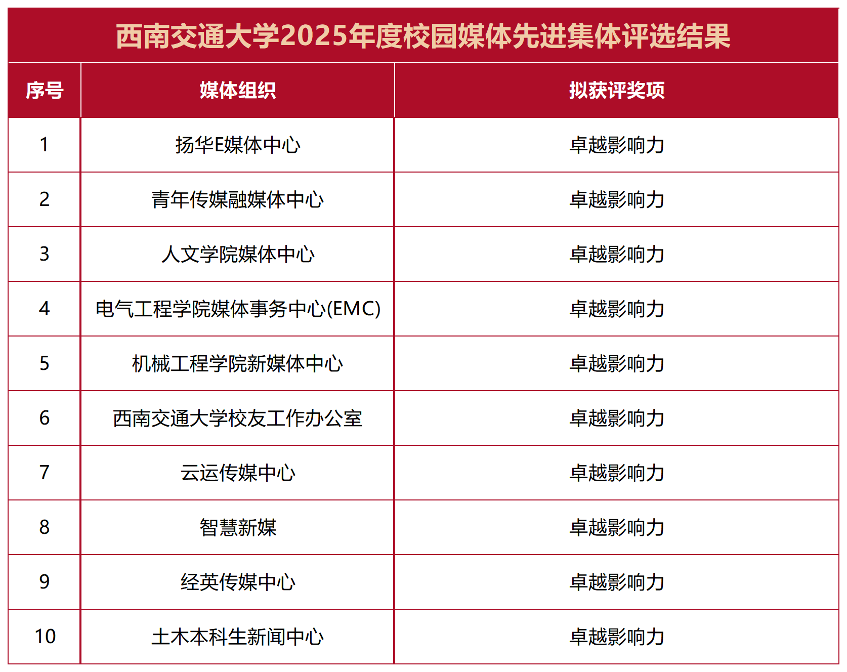 根据西南交通大学2025年度校园媒体先进集体和十佳传媒之星评选工作安排,经过组织推荐、材料函评和现场答辩等环节,现将2025年度校园媒体先进集体和十佳传媒之星评选结果予以公示。