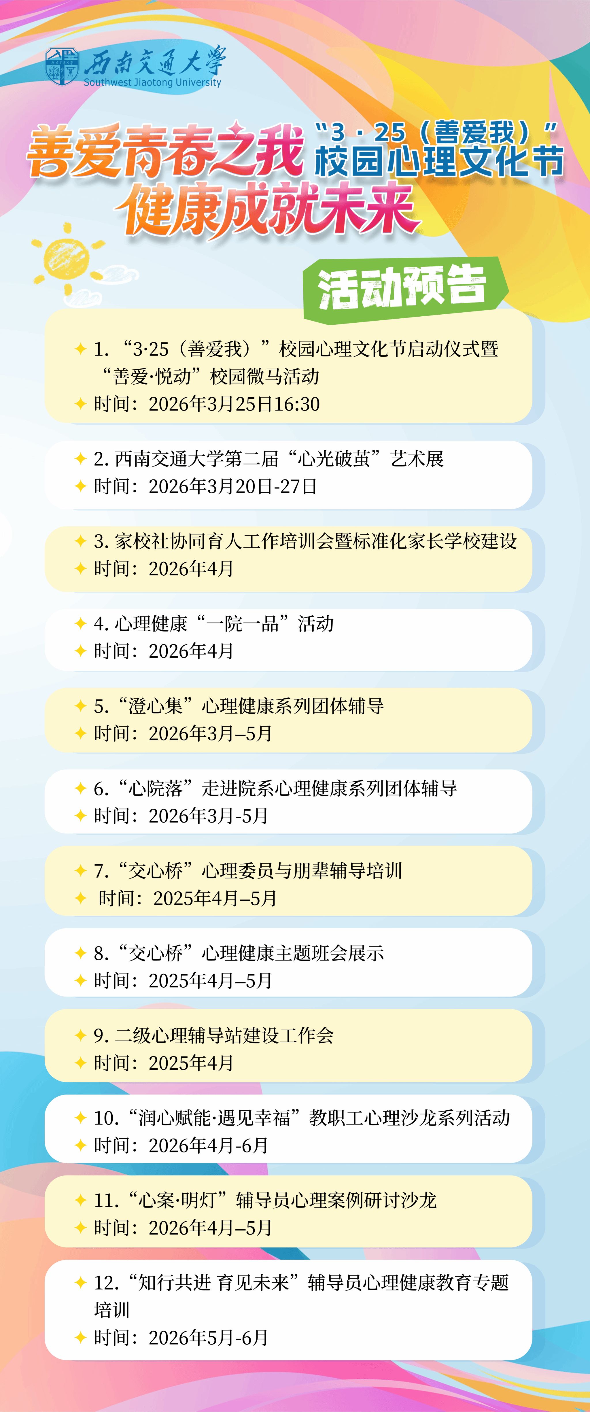 西南交通大学“3·25善爱我”校园心理文化节系列活动预告