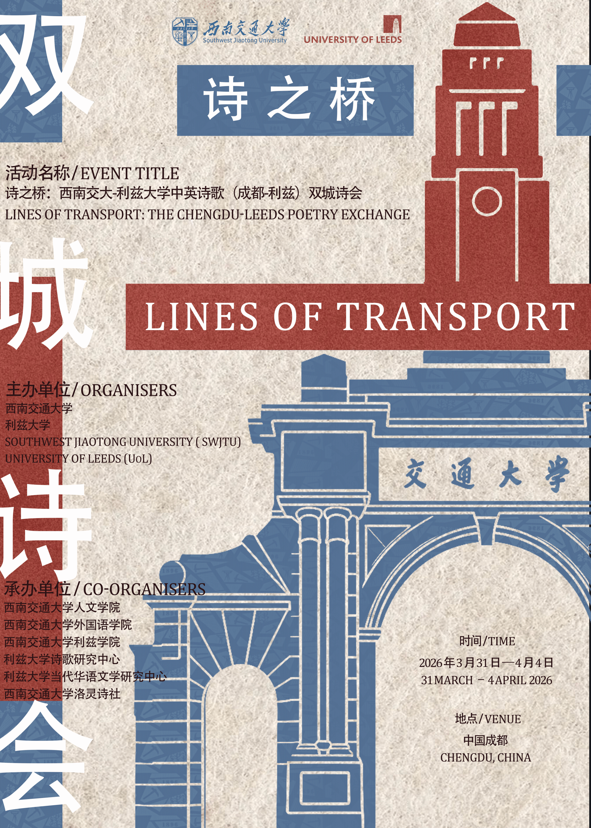 为庆祝西南交通大学建校130周年,搭建中英诗歌文化交流的桥梁,促进当代诗歌与日常生活的深度对话,“诗之桥:西南交大—利兹大学中英诗歌(成都—利兹)双城诗会”将于2026年3月31日至4月3日在西南交通大学举行。本次诗会由西南交通大学与英国利兹大学联合主办,由西南交通大学人文学院、外国语学院、利兹学院,利兹大学诗歌研究中心、利兹大学当代华语文学研究中心,西南交大洛灵诗社联合承办。