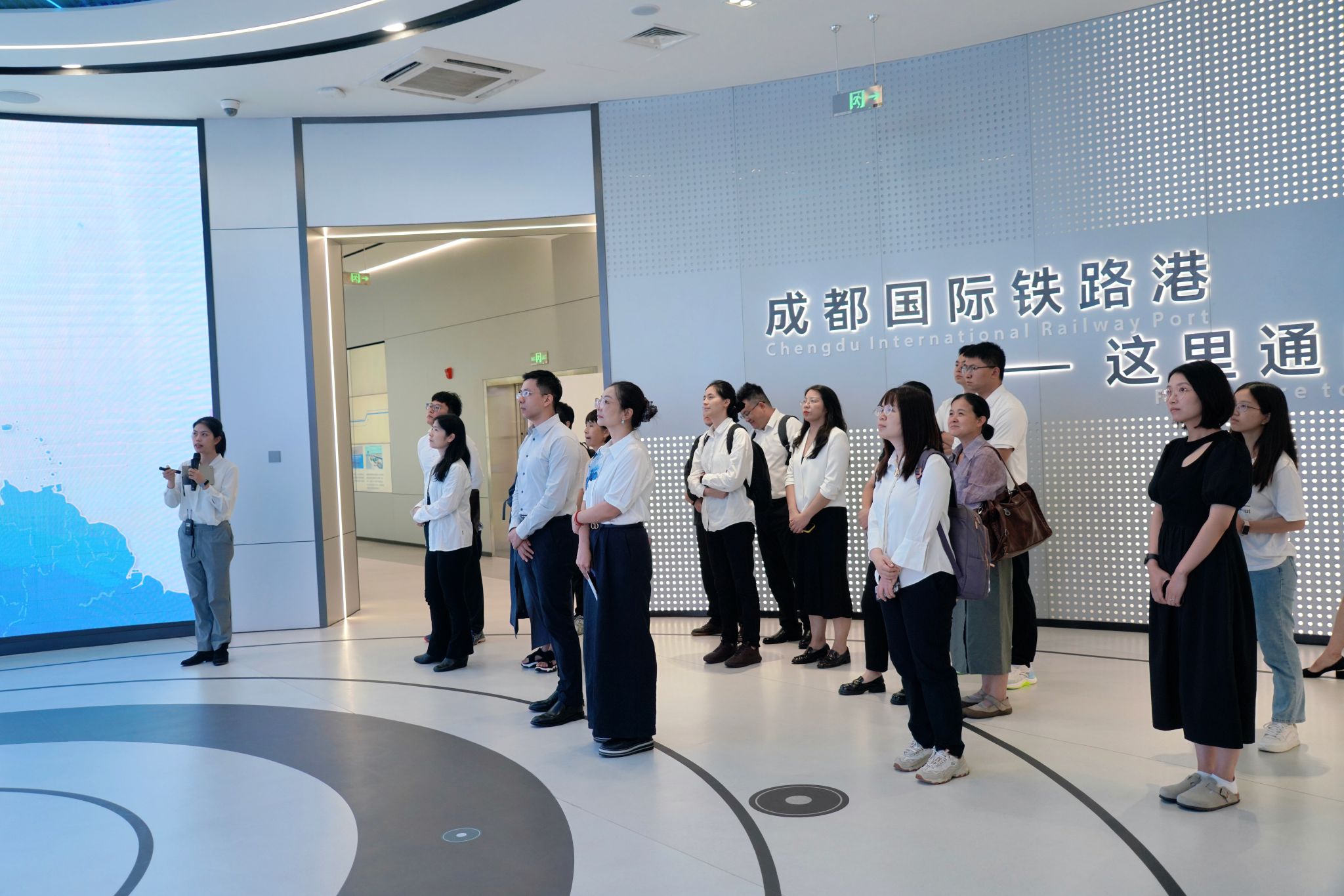 签约仪式结束后,师生代表前往成都国际铁路港展示中心开展实地调研。在讲解员的引导下,师生们通过动态沙盘、数字大屏、实物模型等多元化展示形式,系统了解成都国际铁路港从“单一货运站”到“国家对外开放口岸”的发展历程,以及中欧班列(成都)开行以来在“通道建设、货源组织、国际合作”等方面的运营成果。