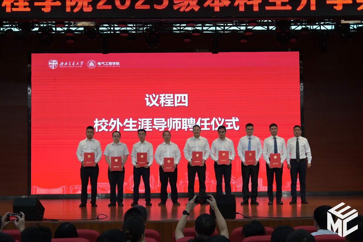典礼上,马光同为校外生涯导师颁发聘书。为帮助同学们做好职业生涯规划、提升就业竞争力,学院首次从优秀院友及行业精英中选聘校外生涯导师,包括电气1班校外生涯导师中铁二院工程集团有限责任公司机动院党总支书记、院长陈世浩,电气2班校外生涯导师南京南瑞继保电气有限公司研究院部门经理吕玮,电气3班校外生涯导师国家电网有限公司西南分部高级专责樊东,电气4班校外生涯导师乐山市委组织部研究室副主任王成杰,电气5班校外生涯导师中国铁路设计集团有限公司机环院机辆所所长侯黎明,电气6班校外生涯导师中铁武汉电气化局集团有限公司党建工作部副部长、机关党委副书记、纪委书记,工会主席金沧海,电气9班校外生涯导师中铁二院工程集团有限责任公司电化院副总工程师杨佳,电气12班校外生涯导师中铁二院工程集团有限责任公司机动院总工程师王利军。