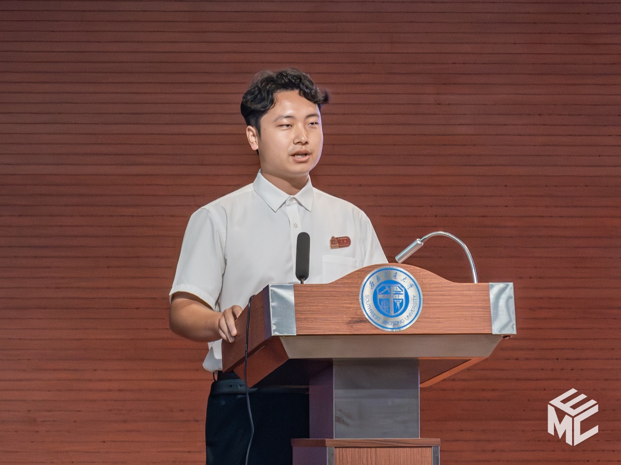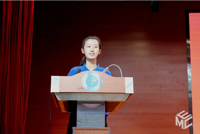 新生代表陈沫以《逐梦交大电气,共赴青春新程》为题发言。她讲述了曹建猷院士等前辈事迹带给她的感动,深刻阐释了自己对电气精神的理解。她代表全体新生,表示将在大学四年里播下三粒梦想的种子:一是“向下扎根,向上绽放”的学业之种,在知识的滋养中生长;二是“自主独立,奔赴美好”的生活之种,从“被照顾”走向“能担当”;三是“自洽内求,达观内省”的自我之种,孕育更丰富的灵魂,写好属于这一代人的青春答卷。