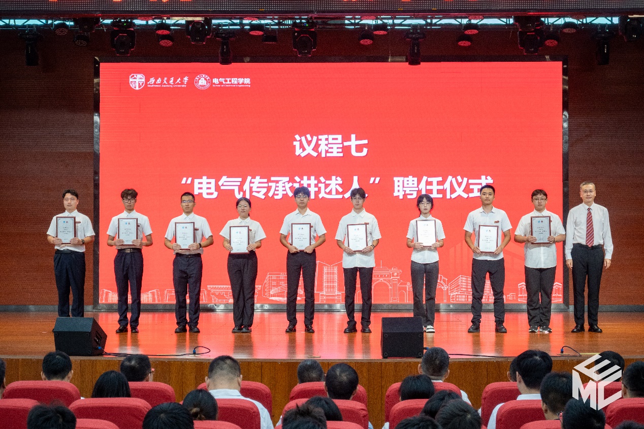 现场还举行第四批“电气传承讲述人”聘任仪式。王斌为“电气传承讲述人”万家晨、常珈川、赵晨虹、石俊良、尹昱翔、郭艺文、付臻、夏明烨、马杨颁发聘书,希望他们做好示范引领,用鲜活的叙事传播好电气声音。