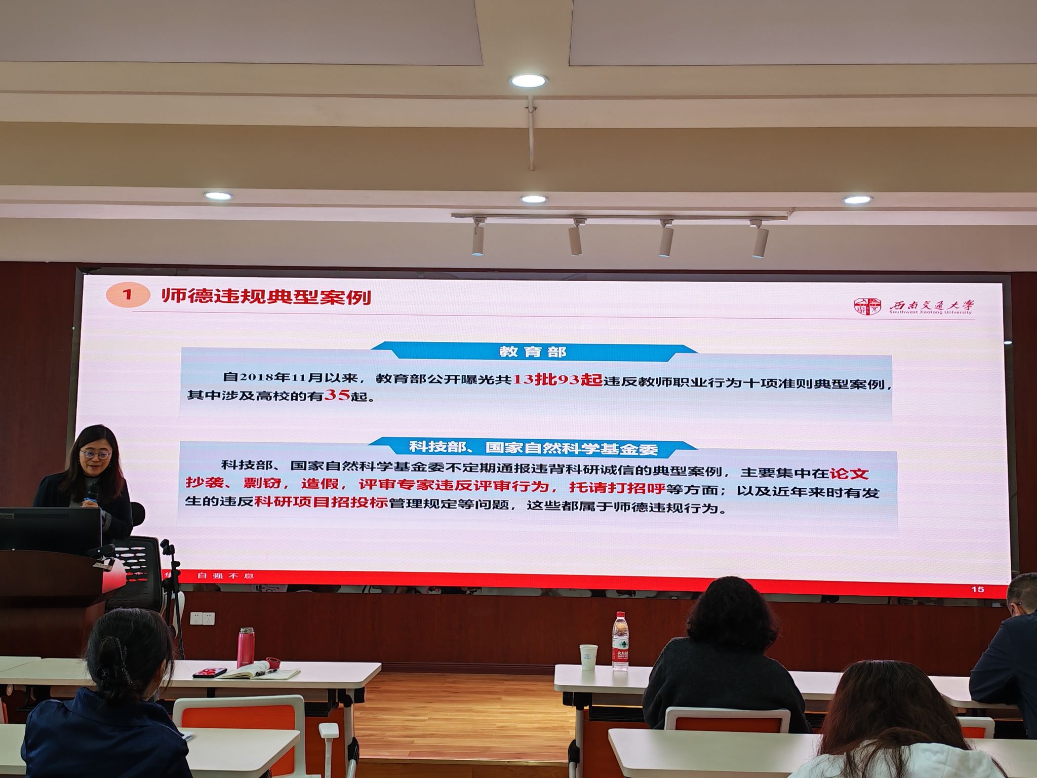 刘咏梅以“恪守十项准则,涵养高尚师德”为题,从师德师风建设的重要性出发,阐述了教师个人加强自身师德师风建设的重要意义。她带领大家学习了《新时代高校教师职业行为十大准则》的主要内容,并表示教师要积极弘扬教育家精神,将教书与育人相结合,在传授专业知识的同时,更要注重培养学生的家国情怀与社会责任感,以自己高尚的道德情操和职业操守做好学生的榜样。刘咏梅组织全体与会人员学习了近年来高校违反师德师风典型案例,通过以案为镜、以案明纪,督促全体教职工在日常工作和生活中加强纪律意识和规矩意识,知敬畏、存戒惧、守底线。