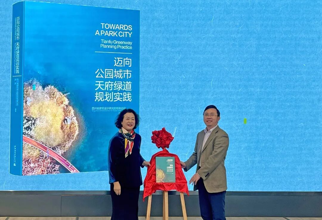 在与会嘉宾的见证下,高静与西南交通大学建筑学院党委书记胡伟共同为公园城市建设成果——《迈向公园城市——天府绿道规划实践》新书揭幕。