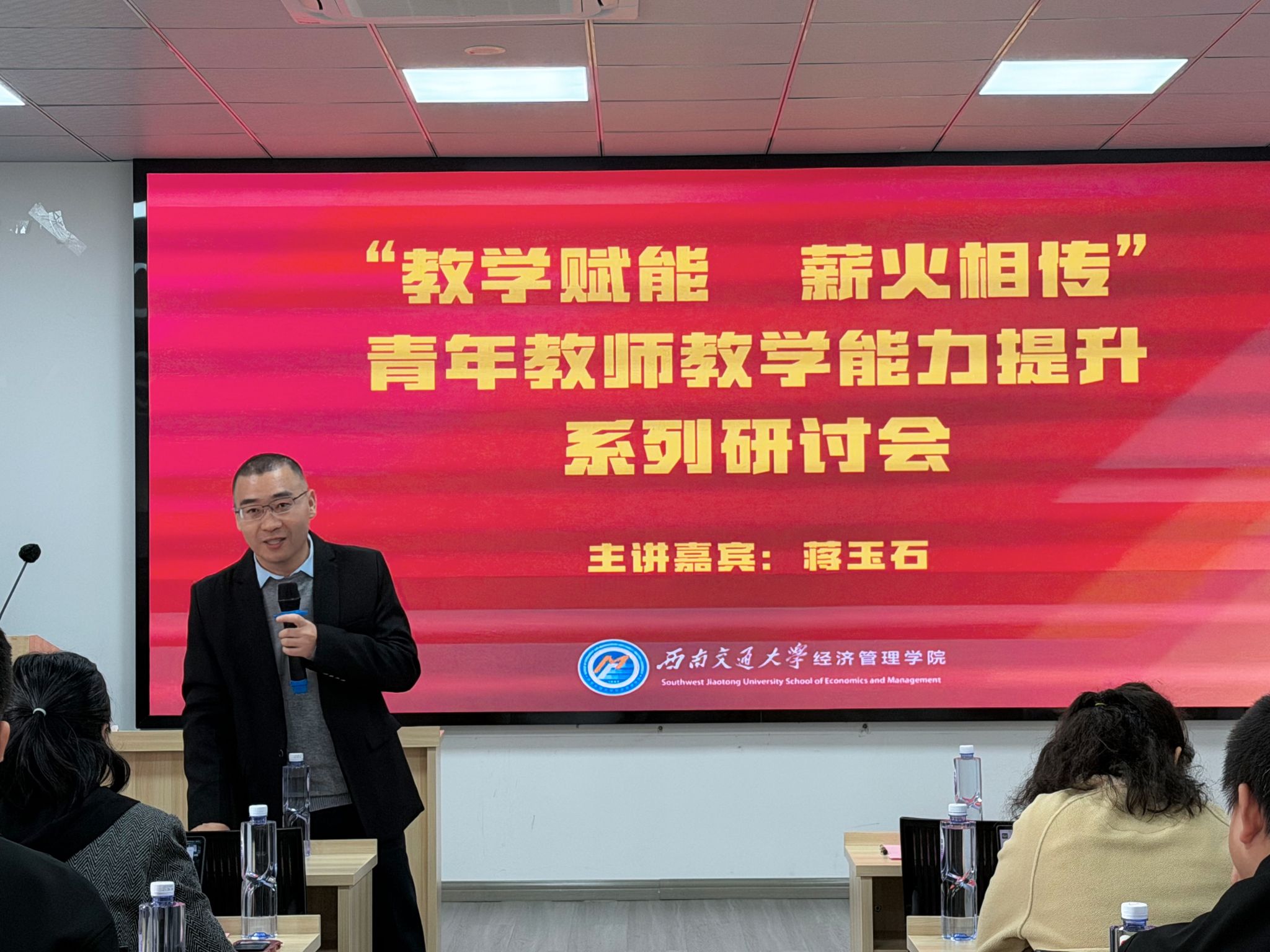 为提升青年教师教学水平,全面助力学院教师备战第十二届青年教师教学竞赛复赛,充分发挥骨干教师的示范引领与“传、帮、带”作用,经济管理学院开展“教学赋能,薪火相传”系列教学研讨活动。10月27日上午,首场研讨会在九里校区零号教学楼J0819举办,特邀蒋玉石教授担任主讲,聚焦“‘翻转’与‘对话’——以学生为中心的高效课堂互动模式设计”,为在场青年教师带来一场理念前沿、内容扎实的教学智慧分享。
