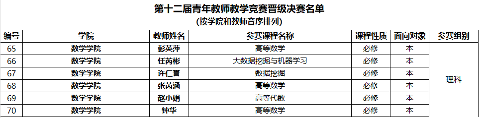 为深入贯彻落实立德树人根本任务,强化青年教师教学能力培养,搭建教学经验交流与风采展示平台,10月30日,在西南交通大学第十二届青年教师教学竞赛复赛中,数学学院11名青年教师参加选拔,最终彭英萍、任芮彬、许仁誉、张芮涵、赵小娟、钟华6名教师凭借优异表现晋级决赛。