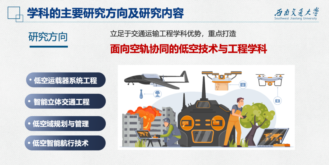 2025年6月,国务院学位委员会下发《关于做好低空技术与工程交叉学科学位授予点超常布局试点工作的通知》。西南交通大学瞄准国家战略迫切需求,依托交通运输工程一级学科(A+),由扬华讲席教授张建平研究员担任学科带头人,成立空中交通研究院,联合多学科团队共同制定研究方向、人才培养方案、管理制度和学科建设发展规划,打造场景聚焦、特色鲜明的“低空技术与工程”自主设置目录外二级学科博士硕士学位授予点。