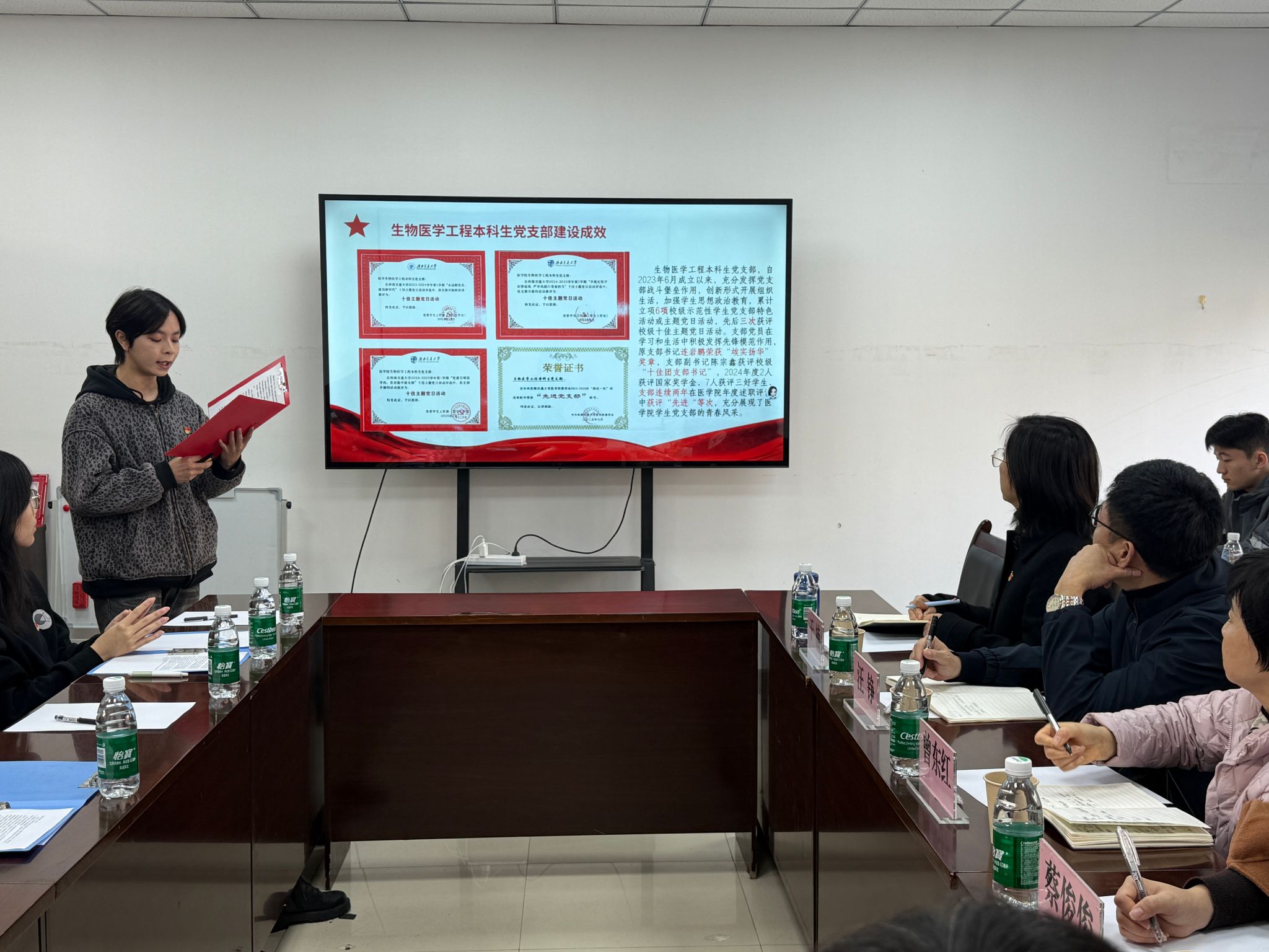党支部副书记陈宗鑫就2025年度支部建设情况进行汇报。目前,支部共有党员32名,其中正式党员10人、预备党员22人。五名支委协同配合,夯实组织基础。支部全年规范召开党员大会5次,开展主题党日活动8次,其中“学规例行,助学攻坚”活动获评校级“十佳主题党日活动”,天府家风馆廉洁教育、保路运动史事陈列馆红色研学等特色活动成效显著。自2023年6月成立以来,支部累计立项校级示范活动6项,三次荣获“十佳主题党日活动”,连续两年获评医学院“先进”党支部,原支部书记连岩鹏荣获“竢实扬华”奖章,充分彰显了支部的战斗堡垒与党员先锋作用。