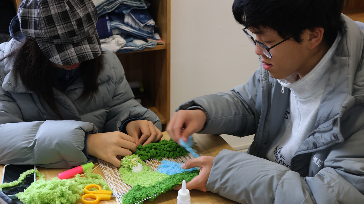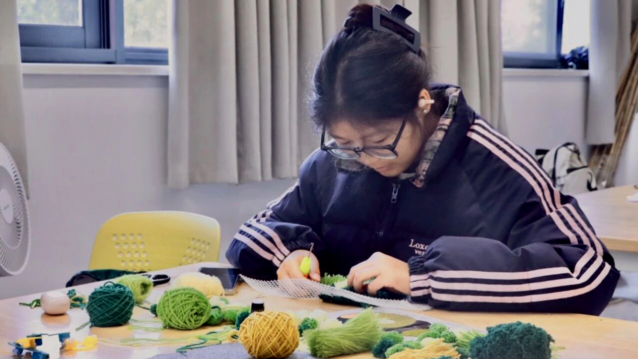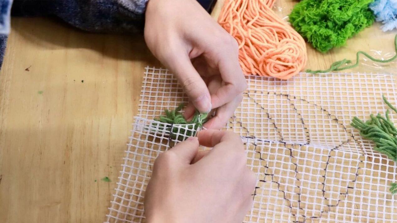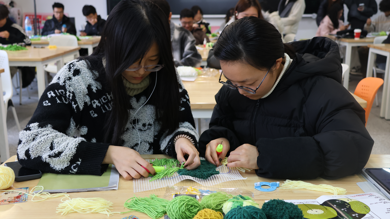 从最初的临摹与模仿,到尝试将传统纹样进行拆解、重组、变形,同学们在一次次尝试中逐步找到属于自己的表达方式。现场气氛热烈,不少跨专业同学在合作中激发出新鲜的创意火花。每位同学以约20厘米见方的纤维艺术小作品为载体,运用毛线、棉线、丝线等材料,在经纬交织间模拟地毯式的织造肌理,以绿色为主调进行创作。