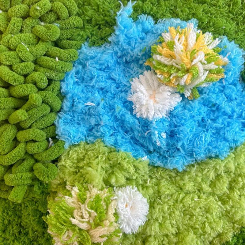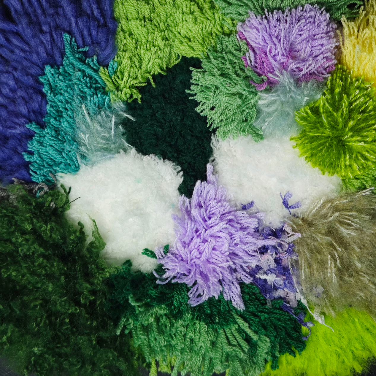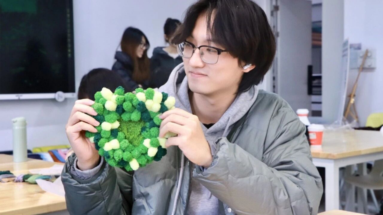 从最初的临摹与模仿,到尝试将传统纹样进行拆解、重组、变形,同学们在一次次尝试中逐步找到属于自己的表达方式。现场气氛热烈,不少跨专业同学在合作中激发出新鲜的创意火花。每位同学以约20厘米见方的纤维艺术小作品为载体,运用毛线、棉线、丝线等材料,在经纬交织间模拟地毯式的织造肌理,以绿色为主调进行创作。