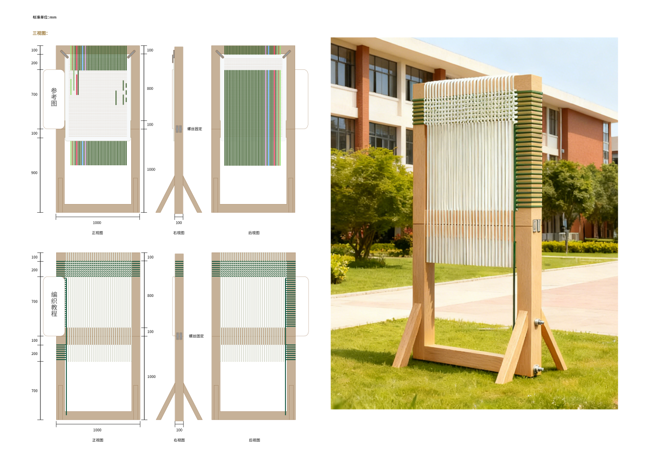 有的小组以“从四川出发”为灵感,将层层叠叠的线迹编织成布满苔藓的蜀道意象,用高低起伏的纹理暗示山路的曲折与潮湿;也有同学把作品想象成丝绸之路上的一方绿洲,在象征黄沙的底色中织入一块块跳跃的“路上的绿意”,寓意旅程中的歇脚点与生命补给站。围绕“苔藓之路”“绿洲驿站”“生长中的丝路”等多个微主题,同学们在反复尝试中探索传统编织技艺与生态想象、地域记忆、当代生活之间的连接,经纬线间渐渐浮现出一块块饱含个人叙事的“丝路纤维地图”。