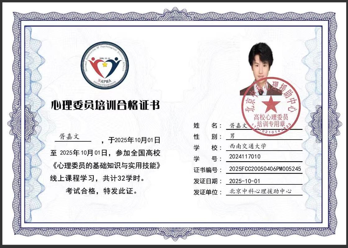 为夯实心理健康教育的专业基础,胥嘉文持续投入精力进行学习与实践。他不仅修读了《心理健康与创新能力》《大学生朋辈心理辅导》等相关课程,还获得了全国高校“心理委员基础知识与实用技能”培训证书。