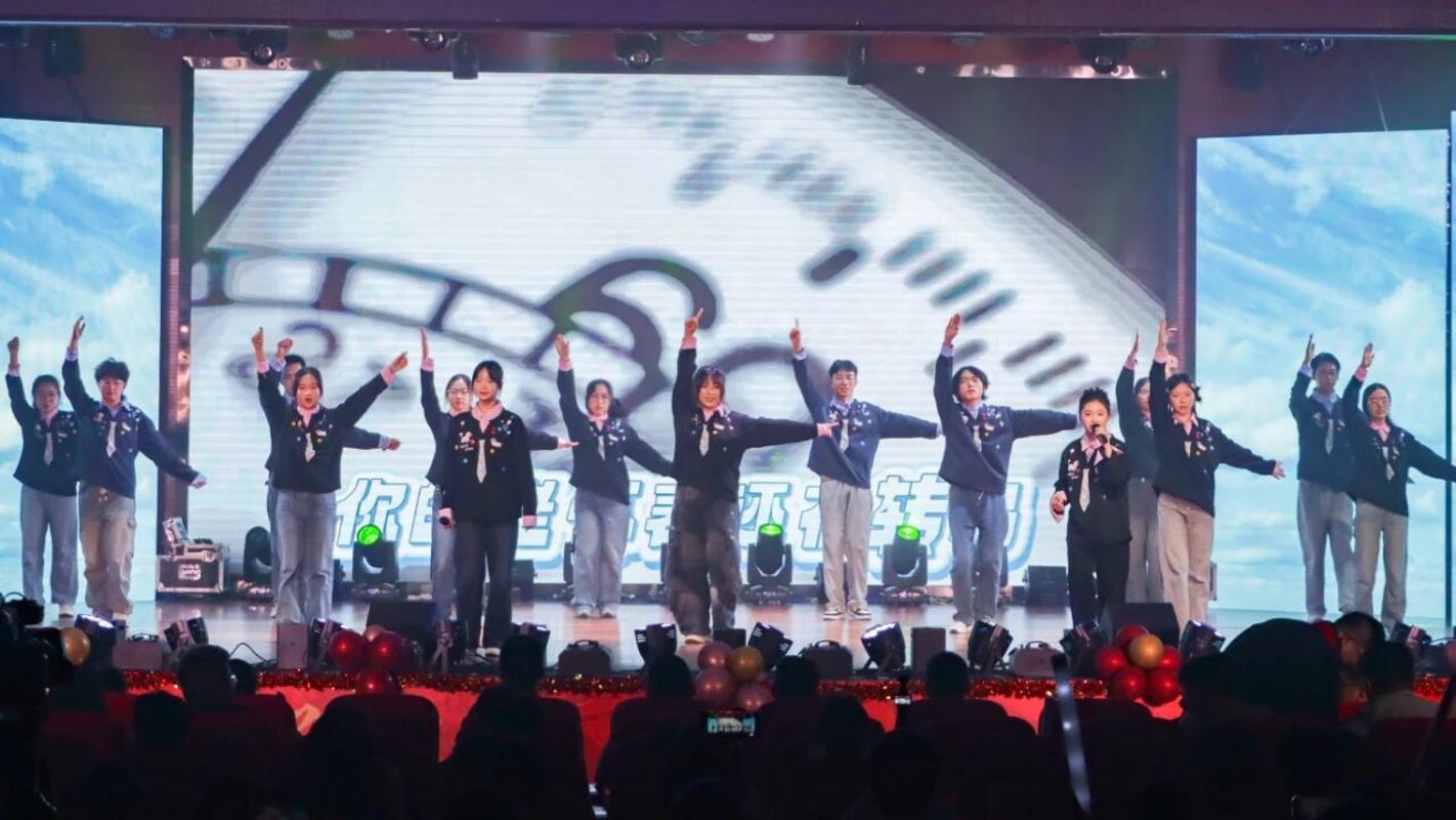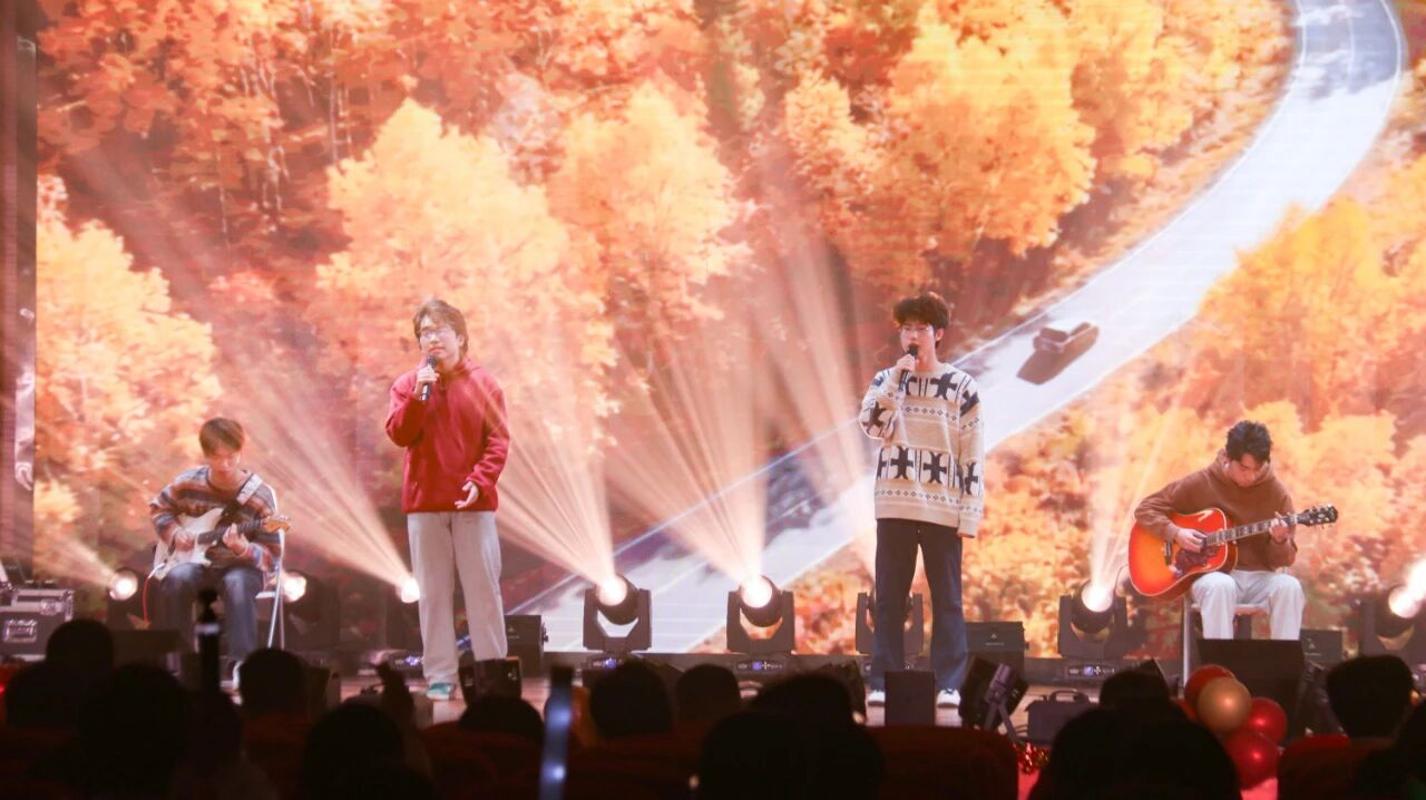 两把吉他,四个声音,编织出了浓浓的思乡情。张艳阳、辛立恒、周圣昔、陈国晟一同弹唱《落叶归根》。他们用清澈的嗓音和细腻的演奏,将游子思乡的情愫娓娓道来,展现了交运学子的柔情与深情。他们真挚的情感打动了在场的每一位观众。