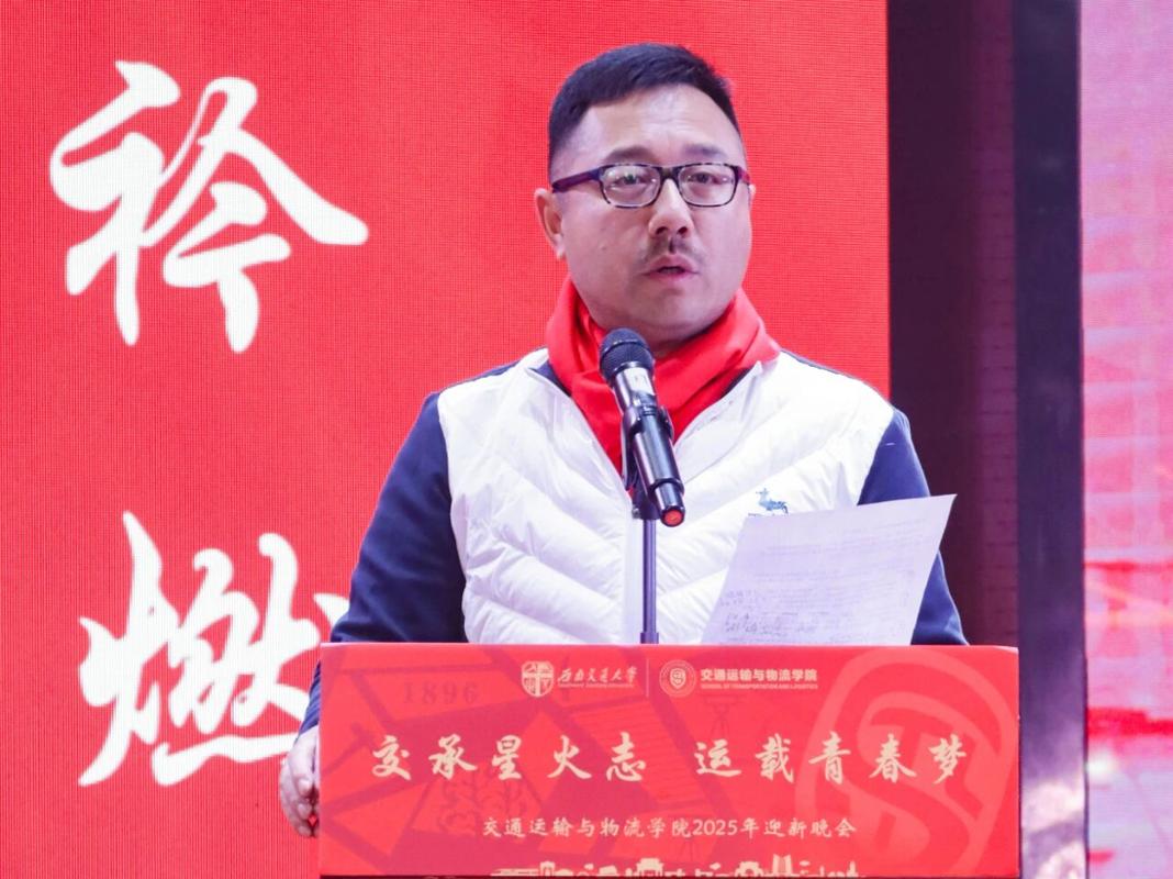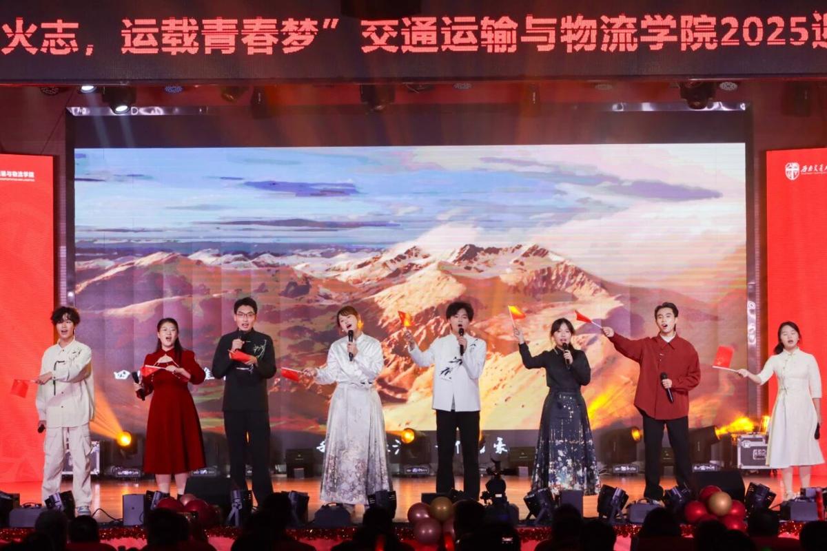 伴随着《我爱你中国》的深情演唱,晚会拉开帷幕。交通运输与物流学院院长刘晓波发表致辞。他向2025级新生致以诚挚欢迎,并希望每一名同学珍惜四年求学时光,以开放包容的心态积极探索,在不断尝试中锤炼品格,在人生的旅途中行稳致远。