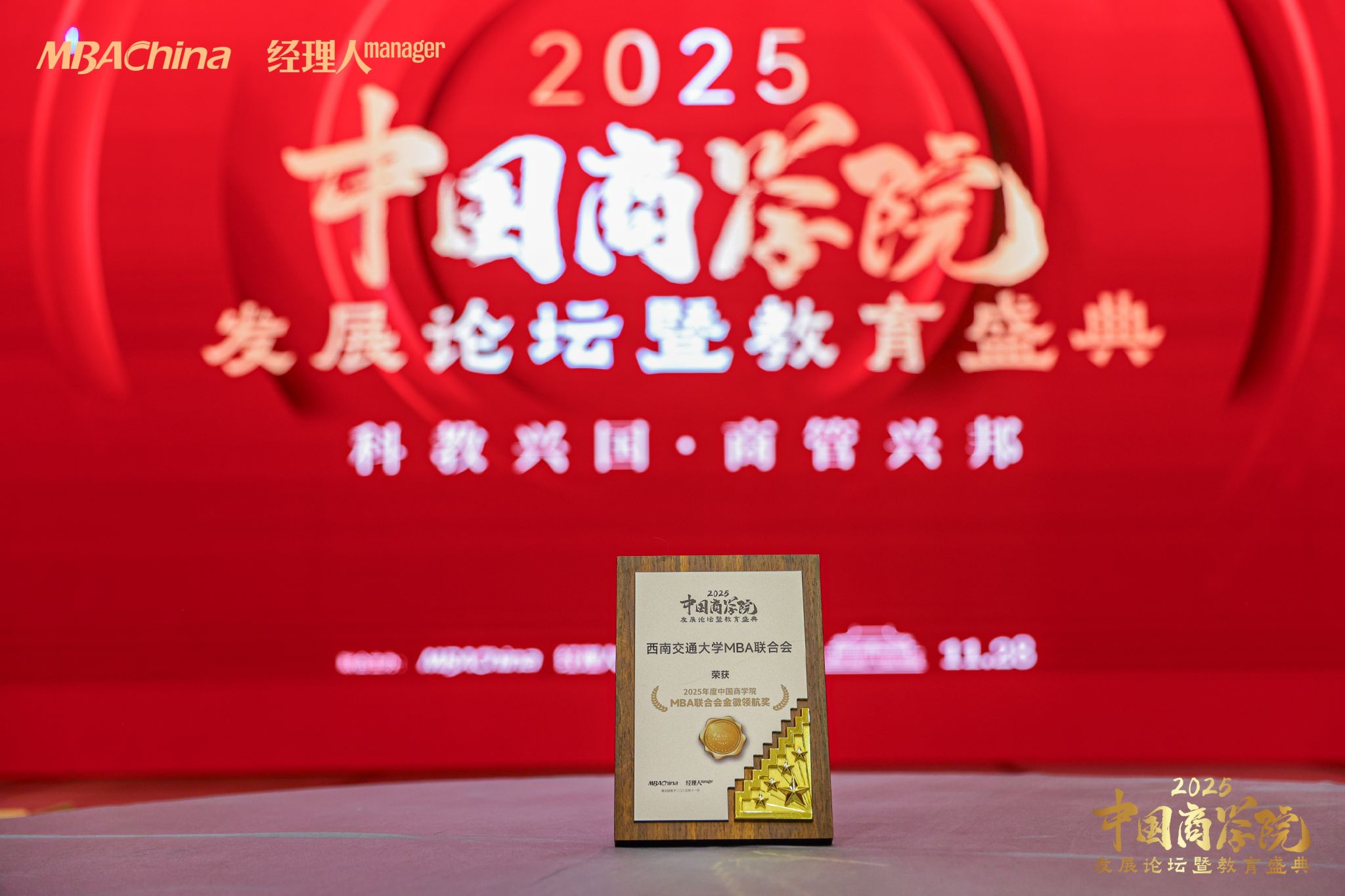 西南交通大学MBA联合会凭借突出的组织力、强大的凝聚力与创新的活动策划荣获“2025年度中国商学院MBA联合会金徽领航奖”。
