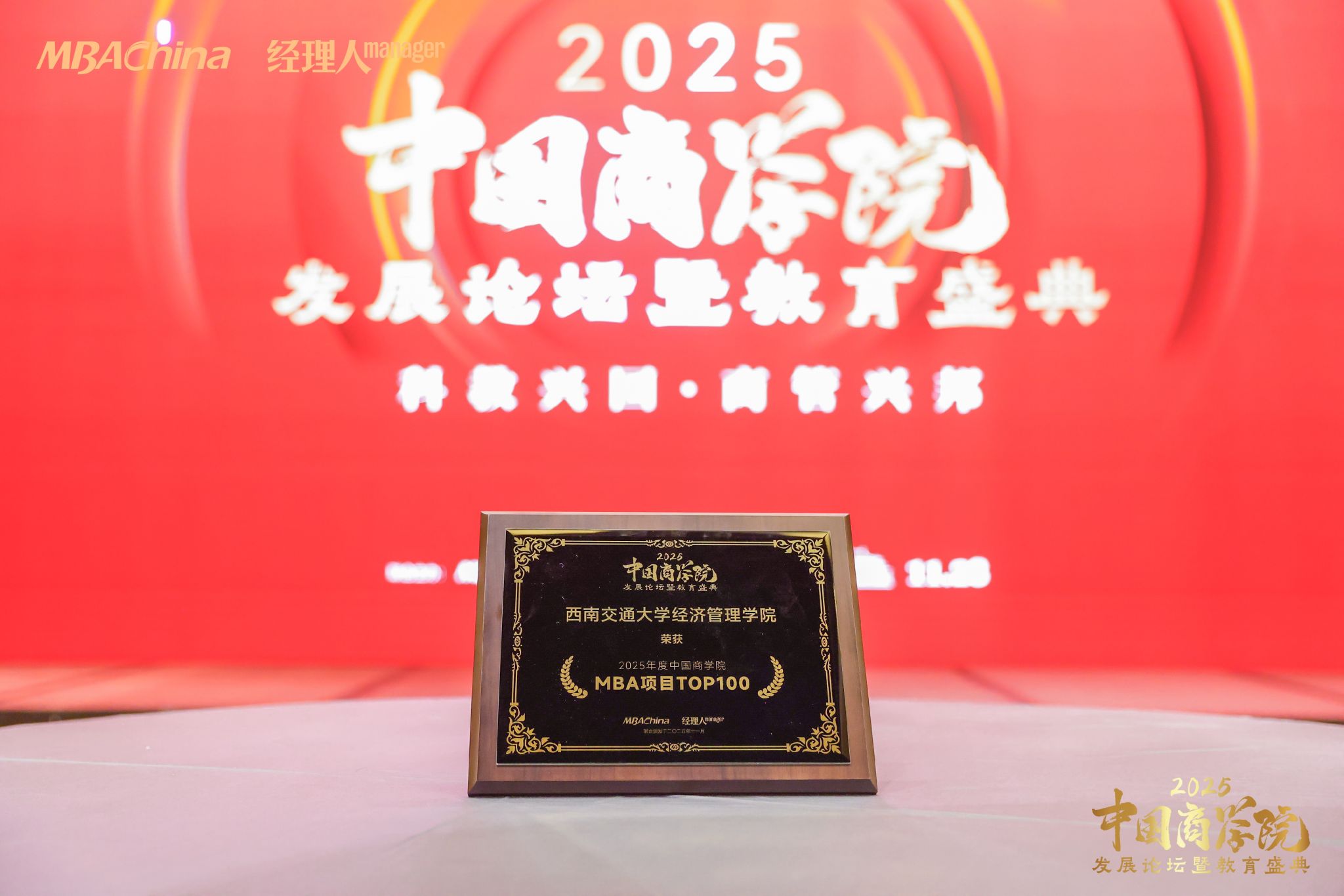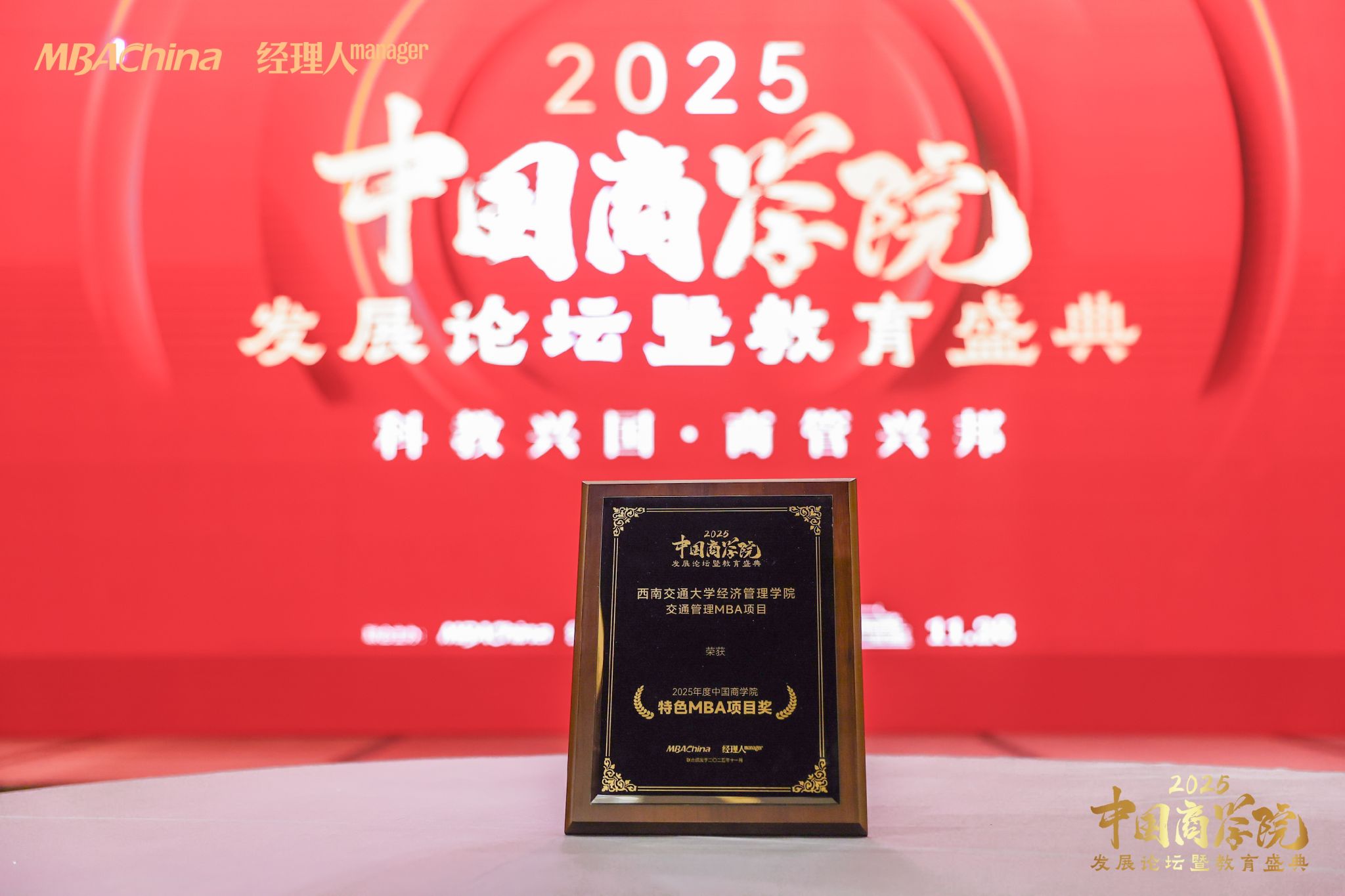 以商学赋能强国建设,以初心培育时代英才。11月28日,由MBAChina与《经理人》杂志联合主办的2025年度中国商学院发展论坛暨教育盛典在北京隆重举行。三百余位教育界专家学者、院校领导、行业领军人物及权威媒体齐聚一堂,分享前沿教育理念,研讨未来发展趋势,共同见证中国商科教育年度荣耀。西南交通大学经济管理学院凭借深厚的办学积淀、鲜明的行业特色与卓越的育人成效,在此次盛典中斩获多项重量级荣誉,彰显了学院在商学教育领域的强劲综合实力与广泛行业影响力。
