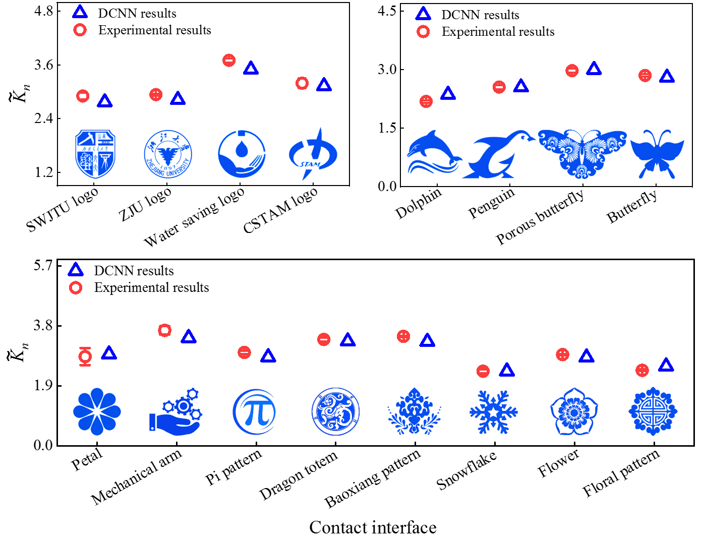 图4. 由深度学习(DCNN)模型预测和实验测量的具有非规则构型接触界面的归一化接触刚度Kn。每个样本五次实验的平均值和标准差分别用红色的空心圆和误差条标记。